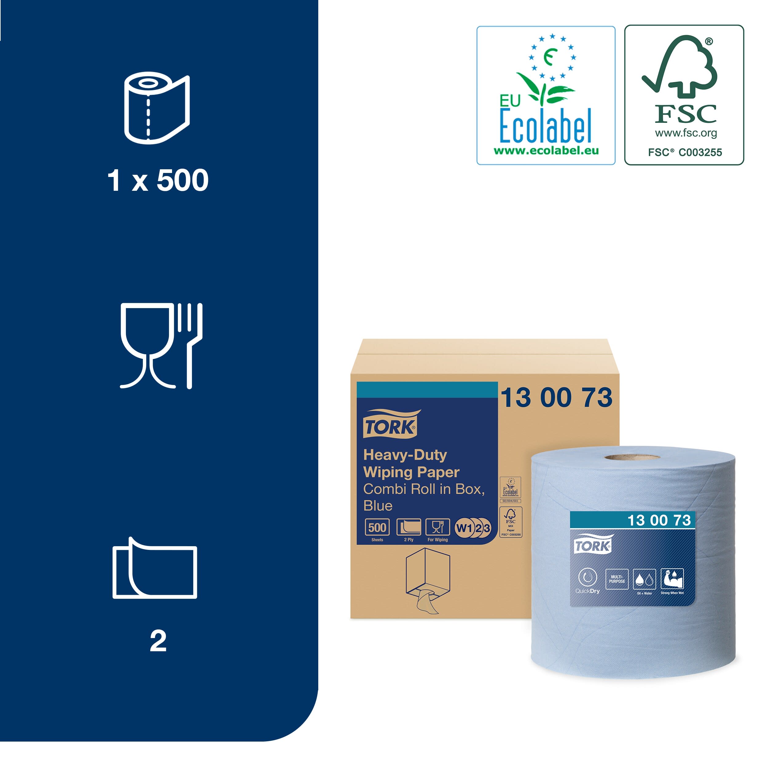 This is Centrefeed of 1 Blue Heavy-Duty Wiping Paper Paper Wipes manufactured by Tork. The manufacturer part number is 130073. Better World Verification Options - eu ecolabel, fsc certified. It has about 170 m x 258mm size sheet . Is it a better world product? yes. In addition, 258mm is the Sheet Width of the product. It has 2 ply . It includes 500 sheets . It features h-d wiping paper range. The product is provided with 1700mm length. It has a form factor of roll. It has a decent blue colour.