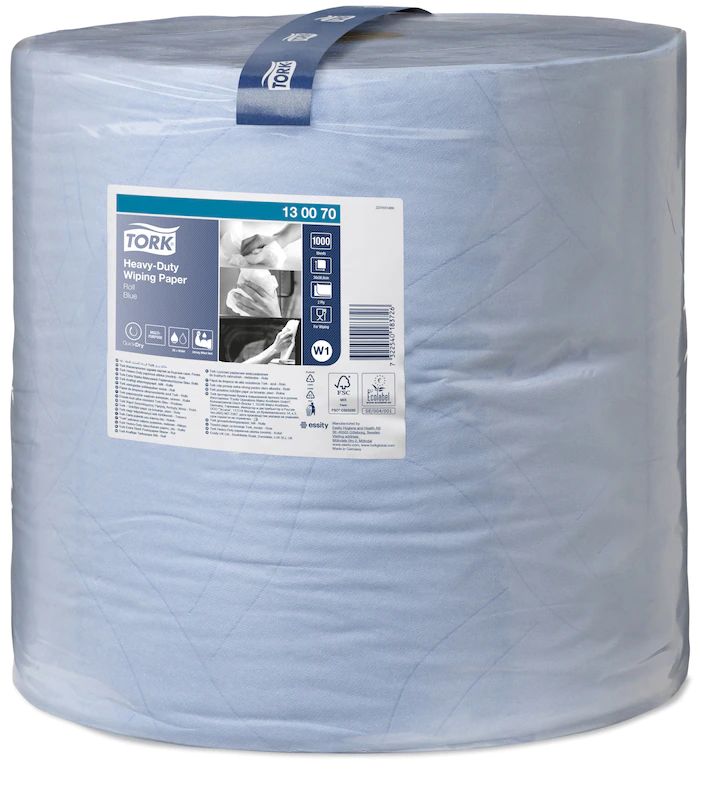 The Tork 130070 is a high-performance, two-ply wiping roll engineered for absorbing large spills, oils, and grease in industrial and professional environments. This robust paper wipe, part of the H-D Wiping Paper range, provides excellent strength and wet durability for tough clean-up tasks, often outperforming rags. Available as a single blue roll with 1000 sheets, it is an essential resource for effective maintenance, helping reduce consumption and promote efficiency. The product is also environmentally conscious, holding both the EU Ecolabel and FSC certification.