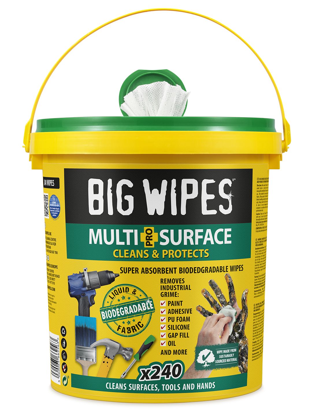 This is Canister of 150 Clear 4x4 Heavy-Duty Multi-Purpose Multi-Surface Wipes Multi-purpose Wipes manufactured by Big Wipes. The manufacturer part number is 2447 0000. It is assigned with a trade name of xl super towels pro+. It is designed for single use . Applications Information involves general cleaning. It has a decent clear colour. It contains 240 wipes per pack . It is wet . The package is a sort of bucket. Its wiper is 200 x 300mm in size . It is featured with biodegradable wipes .
