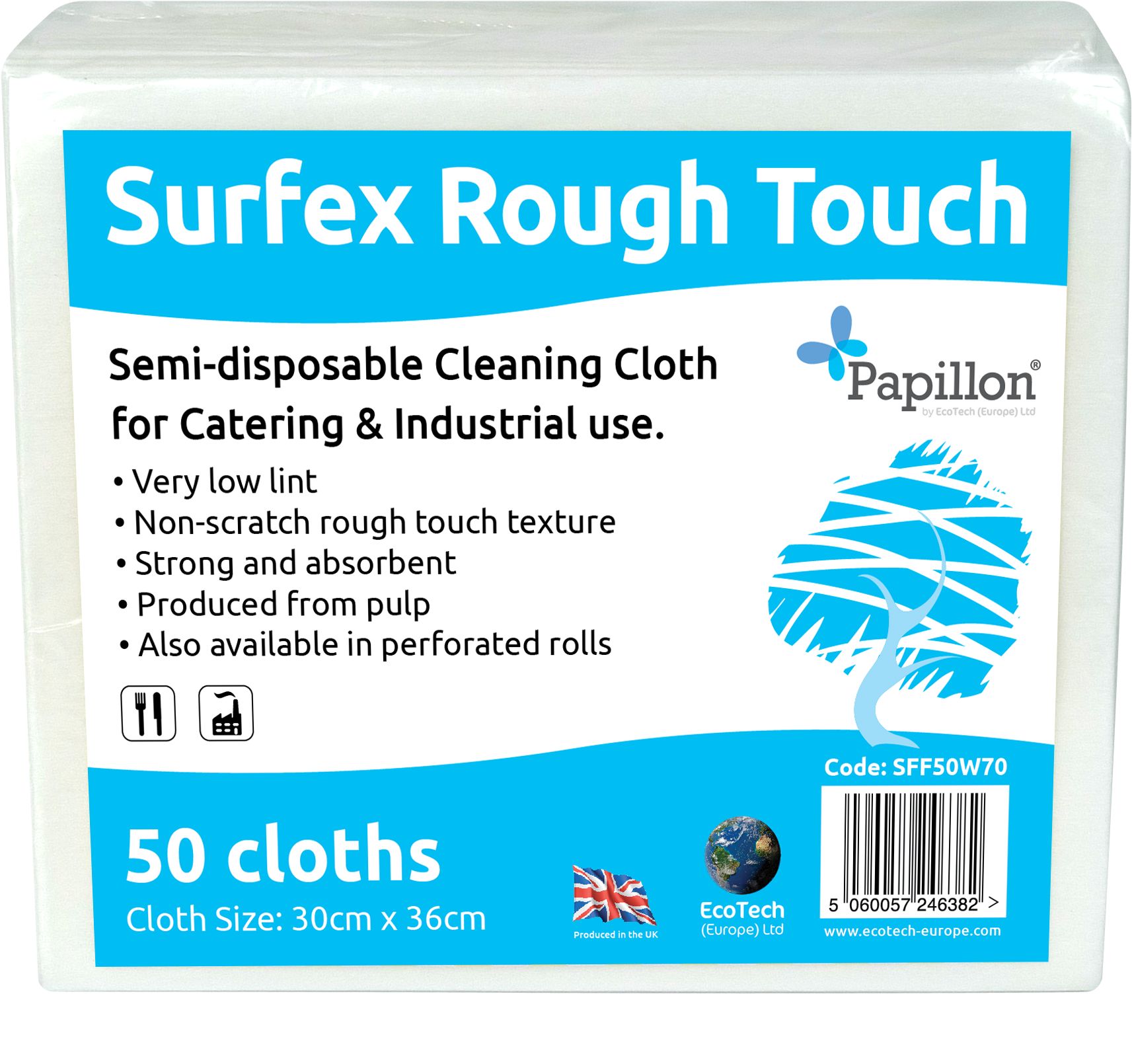 This is Surfex Dry Industrial Wipes Roll of 400 manufactured by EcoTech. The manufacturer part number is SFF400W70. It is assigned with a trade name of surfex. It is dry . It is featured with industrial wipes . Applications Information involves food industry. The package is a sort of roll. It contains 400 wipes per pack .