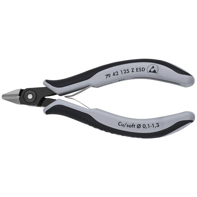 This is manufactured by Knipex Tools LP. The manufacturer part number is 79 42 125 Z ESD. The knipex tools lp's product offers user-desired applications. The product has an integral 5.00" (127.0mm) overall length. The module has the capacity of 0.4mm dia soft wire. The splendid features of the product include esd safe, soft grips. It is assigned with possible HTSUS value of 8203.20.6060. In addition, it is vendor undefined. Its typical moisture sensitivity level is 1 (unlimited). In addition, bulk is the available packaging type of the product. It is a oval product with unique specifications. It has a long 2 weeks standard lead time. It has a flush cut edge. It comes in side (diagonal) configuration. Moreover, it corresponds to 79 42, a base product number of the product. The product is designated with the ear99 code number.