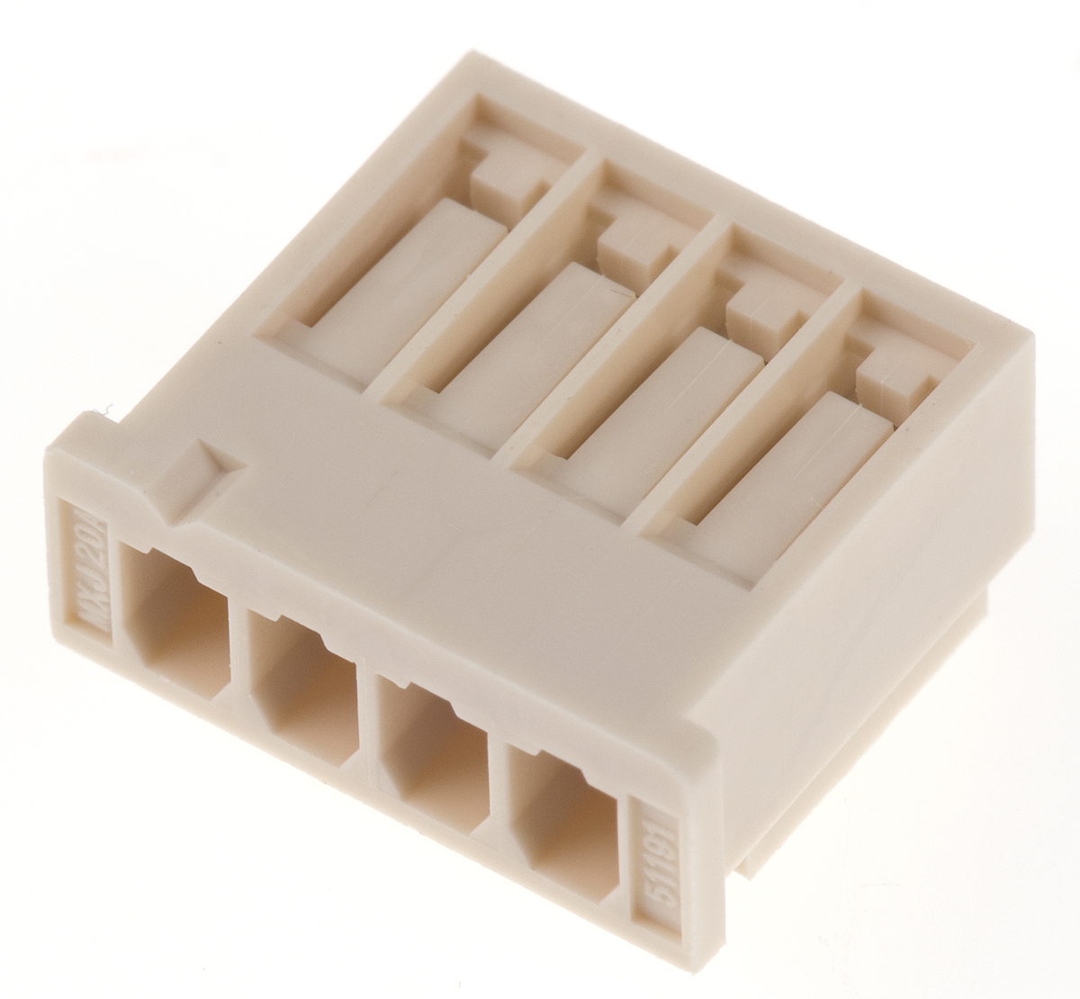 This is 2.5mm Pitch 4 Way 1 Row Female Straight Crimp Connector Housing 51191 manufactured by Molex. The manufacturer part number is 51191-0400. The product is available in cable mount configuration. In addition, female is the available "Gender" of the product. It has straight body orientation. Moreover, the product is 2.5mm. The product also features robust nylon housing material. Furthermore, the product is 6.6mm wide. Its accurate length is 12.5mm. It comes in 1 of rows. The product mini-latch, is a highly preferred choice for users. The product is highly suitable for crimp terminal 50802. The product contains 4 contacts. It is assigned with possible HTSUS value of 8538.90.6000. It is shipped in box package . The product is rohs3 compliant. In addition, it is reach info available upon request. Its typical moisture sensitivity level is vendor undefined. The product is designated with the ear99 code number.