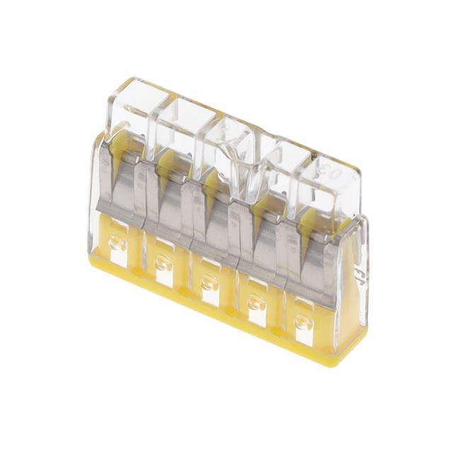 This is manufactured by WAGO Corporation. The manufacturer part number is 2773-405/K000-0002. It is assigned with possible HTSUS value of 8536.90.4000. The product is rohs3 compliant. The terminal is a inline, individual openings (parallel) type. It is shipped in box package . Moreover, the product has a wire gauge of 12-20 awg. It features 5 wire entries. Its typical moisture sensitivity level is not applicable. The product features push in termination style. It has a long 12 weeks standard lead time. It has a classic transparent - yellow colour. The product compact pushwire®, is a highly preferred choice for users. Insulation Option: fully insulated. The product is designated with the ear99 code number.