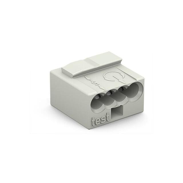 This is manufactured by WAGO Corporation. The manufacturer part number is 243-304. It is assigned with possible HTSUS value of 8536.90.4000. The product is rohs3 compliant. In addition, it is reach unaffected. The terminal is a butt splice, inline, individual openings type. It is shipped in box package . Moreover, the product has a wire gauge of 20-22 awg. It features 4 wire entries. Its typical moisture sensitivity level is not applicable. The product features push in termination style. It has a long 12 weeks standard lead time. The splendid features of the product include releasable. It has a classic gray colour. Insulation Option: fully insulated. The product is designated with the ear99 code number.
