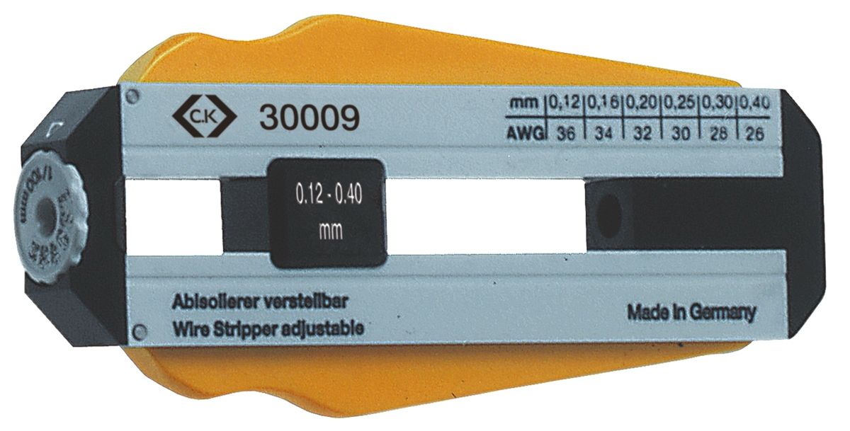 This is Wire Stripper 0.12 → 0.4mm² manufactured by CK. The manufacturer part number is 330009. However, its stripping range is 0.12, 0.16, 0.20, 0.25, 0.30, 0.40mm . It has an overall length of 98 mm. It is a typical wire cable. It has a maximum 0.4mm size . Moreover, it has a minimum 0.12mm size .