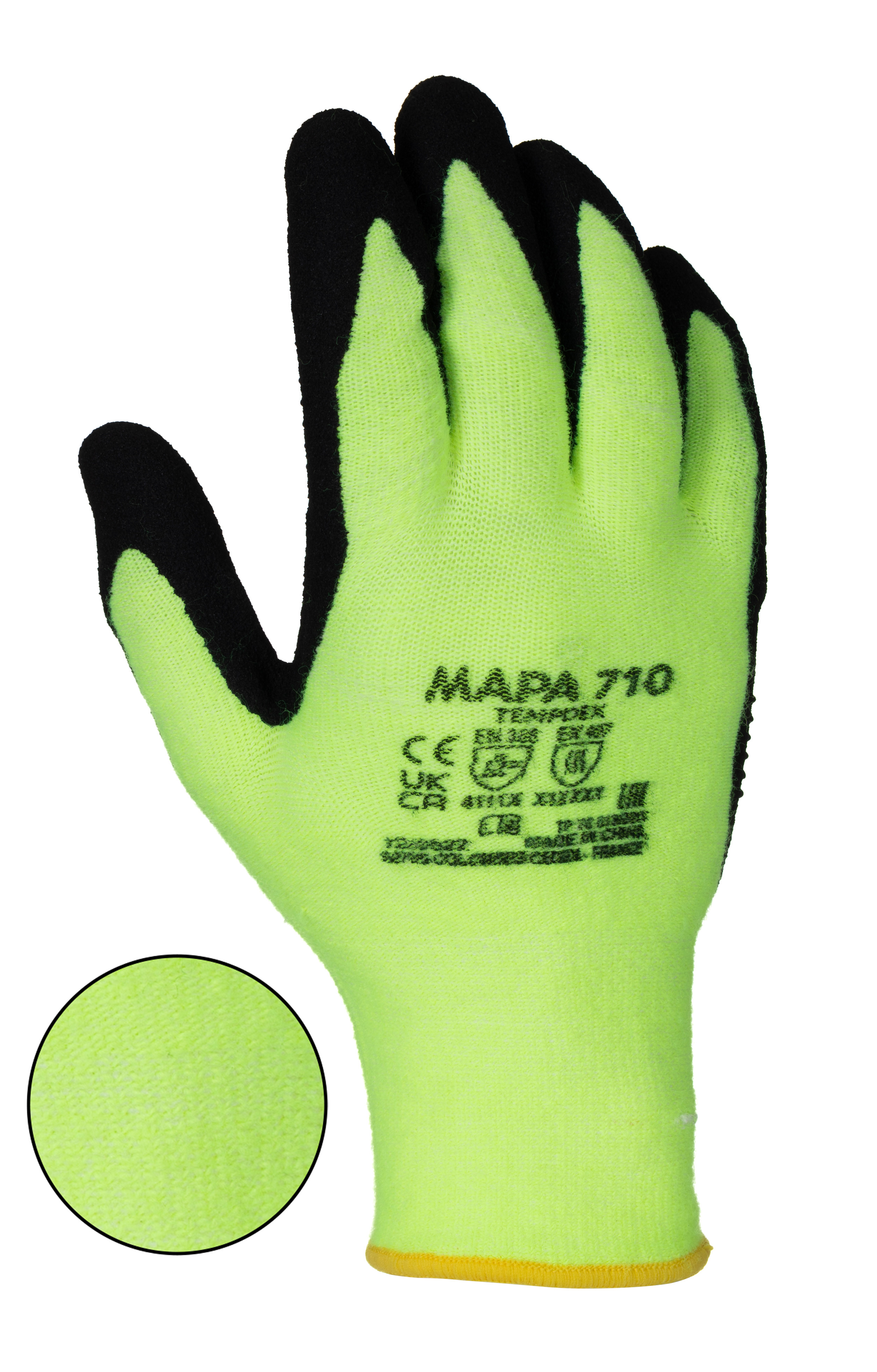 This is Yellow Heat Resistant Nitrile Nitrile-Coated Reusable Gloves 11 - XL manufactured by Mapa. The manufacturer part number is 710 11. It complies with EN407 Thermal standards no . It is compliant with EN374 Chemical standard no . Whereas, its glove coating is of nitrile foam . It has 1 EN388 tear standard . It includes 1 gloves . It complies with EN511 Cold no . The main colour of the glove is yellow . The primary recommended applications for the glove is heat resistant . It has 1 EN388 Puncture standard . It features temp-dex 710 range. It has 4 EN288 abrasion standard . Additionally, its glove is made using nitrile material . The glove has a 11 size. The product complies with EN 61340-5-1 standard no .