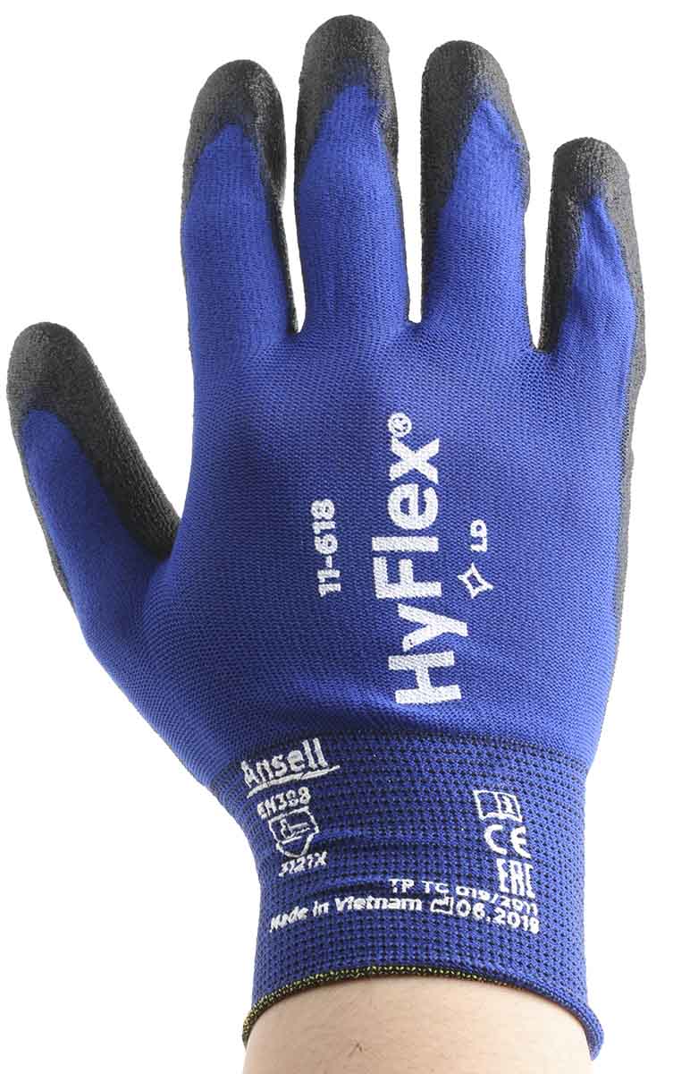 This is HyFlex Black General Purpose Nylon Polyurethane-Coated Reusable Gloves 10 - L manufactured by Ansell. The manufacturer part number is 11-618/10. It complies with EN407 Thermal standards no . It is compliant with EN374 Chemical standard no . Moreover, it is suitable for mechanical hazards EN388 3 1 2 1 x . It has a/an 1 EN 388 blade standard . It has 2 EN388 tear standard . It includes 2 gloves . It complies with EN511 Cold no . The main colour of the glove is blue . The primary recommended applications for the glove is general purpose . It has 1 EN388 Puncture standard . It features hyflex 11-618 range. It has 3 EN288 abrasion standard . Additionally, its glove is made using nylon material . The glove has a 10, large size. The product complies with EN 61340-5-1 standard no . Whereas, its glove coating is of polyurethane .