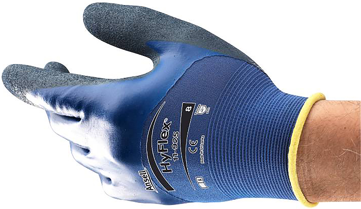This is HyFlex Blue Special Purpose Spandex Nitrile-Coated Oil Resistant Gloves manufactured by Ansell. The manufacturer part number is 11-925/10. It complies with EN407 Thermal standards no . It is compliant with EN374 Chemical standard no . It has a/an 1 EN 388 blade standard . It has 1 EN388 tear standard . It includes 24 gloves . It complies with EN511 Cold no . The main colour of the glove is blue . The primary recommended applications for the glove is oil resistant . It has 1 EN388 Puncture standard . It features hyflex 11-925 range. It has 4 EN288 abrasion standard . Additionally, its glove is made using spandex material . It has an American safety standard ansi abr 3 . The glove has a 10, large size. Whereas, its glove coating is of nitrile .