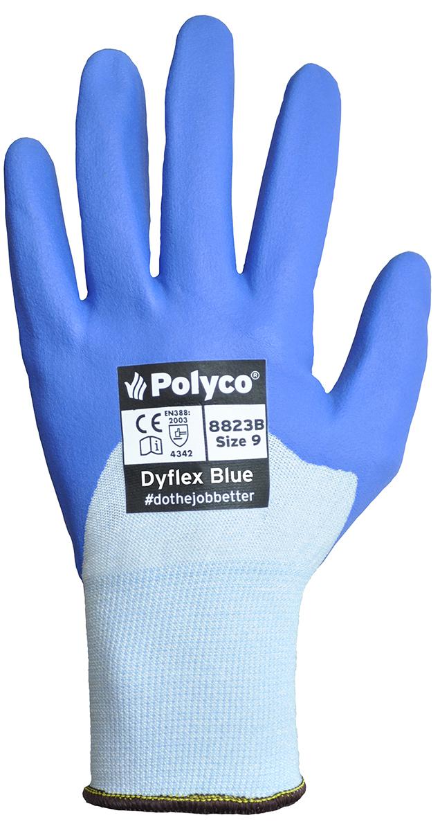 This is Dyflex Blue Cut Resistant Microfoam Nitrile-Coated Reusable Gloves 10 manufactured by BM Polyco. The manufacturer part number is 8824B. It complies with EN407 Thermal standards no . It is compliant with EN374 Chemical standard no . It has a/an x EN 388 blade standard . It has 4 EN388 tear standard . It includes 10pairs gloves . It complies with EN511 Cold no . The main colour of the glove is blue . The primary recommended applications for the glove is cut resistant . It has 2 EN388 Puncture standard . It features dyflex range. It has 4 EN288 abrasion standard . Additionally, its glove is made using dyneema material . The glove has a 10, large size. The product complies with EN 61340-5-1 standard no . Whereas, its glove coating is of nitrile foam .
