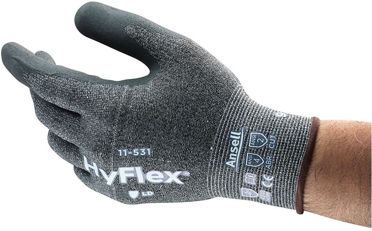 This is HyFlex Grey Cut Resistant Yarn Foam-Coated Reusable Gloves manufactured by Ansell. The manufacturer part number is 11-531/10. It complies with EN407 Thermal standards no . It is compliant with EN374 Chemical standard no . It has a/an x EN 388 blade standard . It has 4 EN388 tear standard . It includes 6 gloves . It complies with EN511 Cold no . The main colour of the glove is grey . The primary recommended applications for the glove is cut resistant . It has 2 EN388 Puncture standard . It features hyflex 11-931 range. It has 4 EN288 abrasion standard . Additionally, its glove is made using nylon material . It has an American safety standard ansi abr 4, ansi cut level 2 . The glove has a 10, large size. The product complies with EN 61340-5-1 standard no . Whereas, its glove coating is of nitrile .