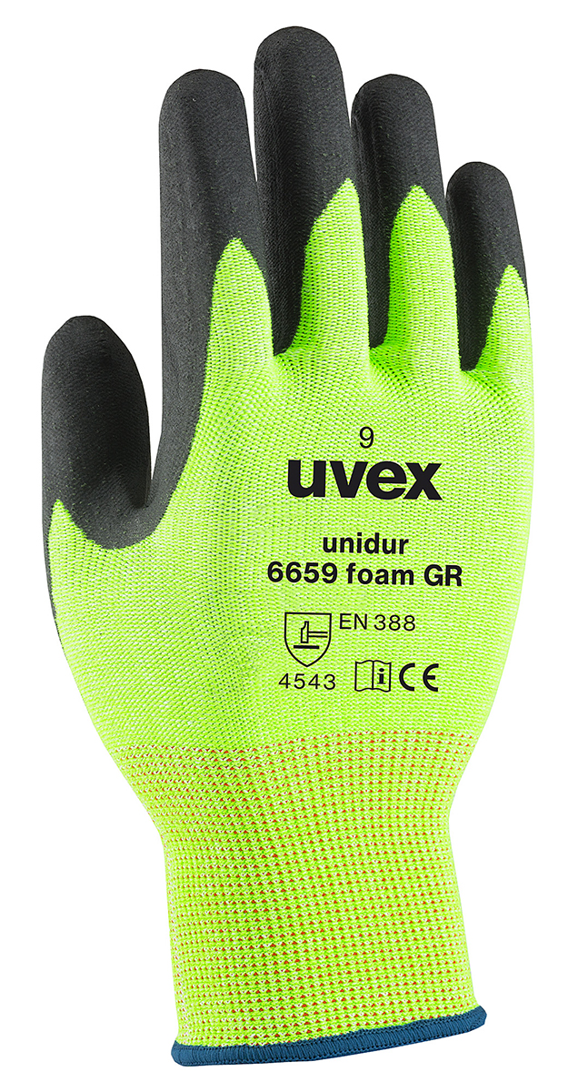 This is Unidur Glass Polyamide HPPE Foam-Coated Cut Resistant Gloves size 11 Green manufactured by Uvex. The manufacturer part number is 60965 11. It complies with EN407 Thermal standards no . It is compliant with EN374 Chemical standard no . It has a/an x EN 388 blade standard . It has 4 EN388 tear standard . It includes 2 gloves . It complies with EN511 Cold no . The main colour of the glove is green . The primary recommended applications for the glove is cut resistant . Moreover, it is suitable for mechanical hazards EN388 en388 . It has 4 EN388 Puncture standard . It features unidur 6659 foam gr range. It has 4 EN288 abrasion standard . Additionally, its glove is made using fibreglass, hppe, polyamide material . The glove has a 11, xl size. Whereas, its glove coating is of nitrile .