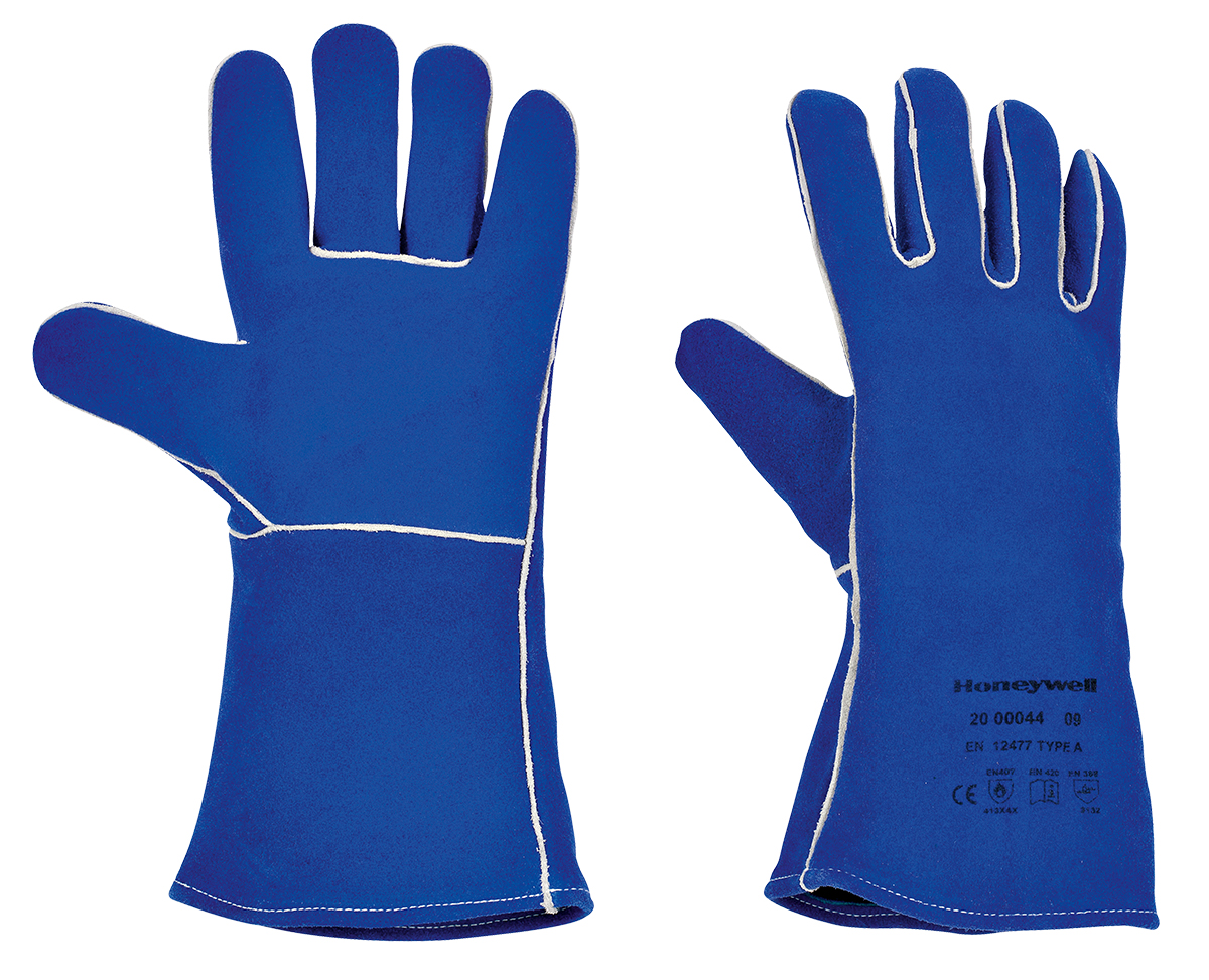 This is Blue Leather Welding Gloves 9 Large manufactured by Honeywell Safety. The manufacturer part number is 2000044 9. It complies with EN407 Thermal standards no . It is compliant with EN374 Chemical standard no . It has 3 EN388 tear standard . It complies with EN511 Cold no . The main colour of the glove is blue . The product complies with EN 61340-5-1 standard no . It has 2 EN388 Puncture standard . It has 3 EN288 abrasion standard . Additionally, its glove is made using leather material . The glove has a 9 size.