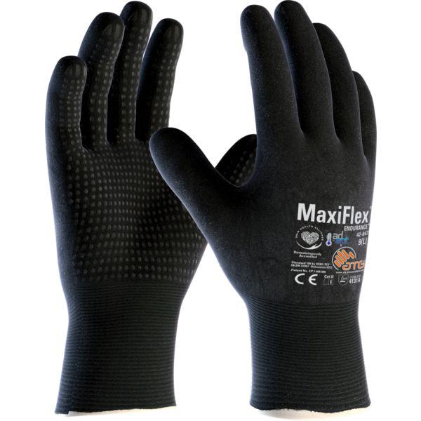 This is Maxiflex Black Grey NBR Coated Spandex Work Gloves Size 9 Large manufactured by ATG. The manufacturer part number is 42-847-09. It complies with EN407 Thermal standards no . It is compliant with EN374 Chemical standard no . Whereas, its glove coating is of nitrile . It has 3 EN388 tear standard . It complies with EN511 Cold no . The main colour of the glove is black . The primary recommended applications for the glove is general purpose . It has 1 EN388 Puncture standard . It features maxiflex range. It has 4 EN288 abrasion standard . Additionally, its glove is made using spandex material . The glove has a 9, large size.