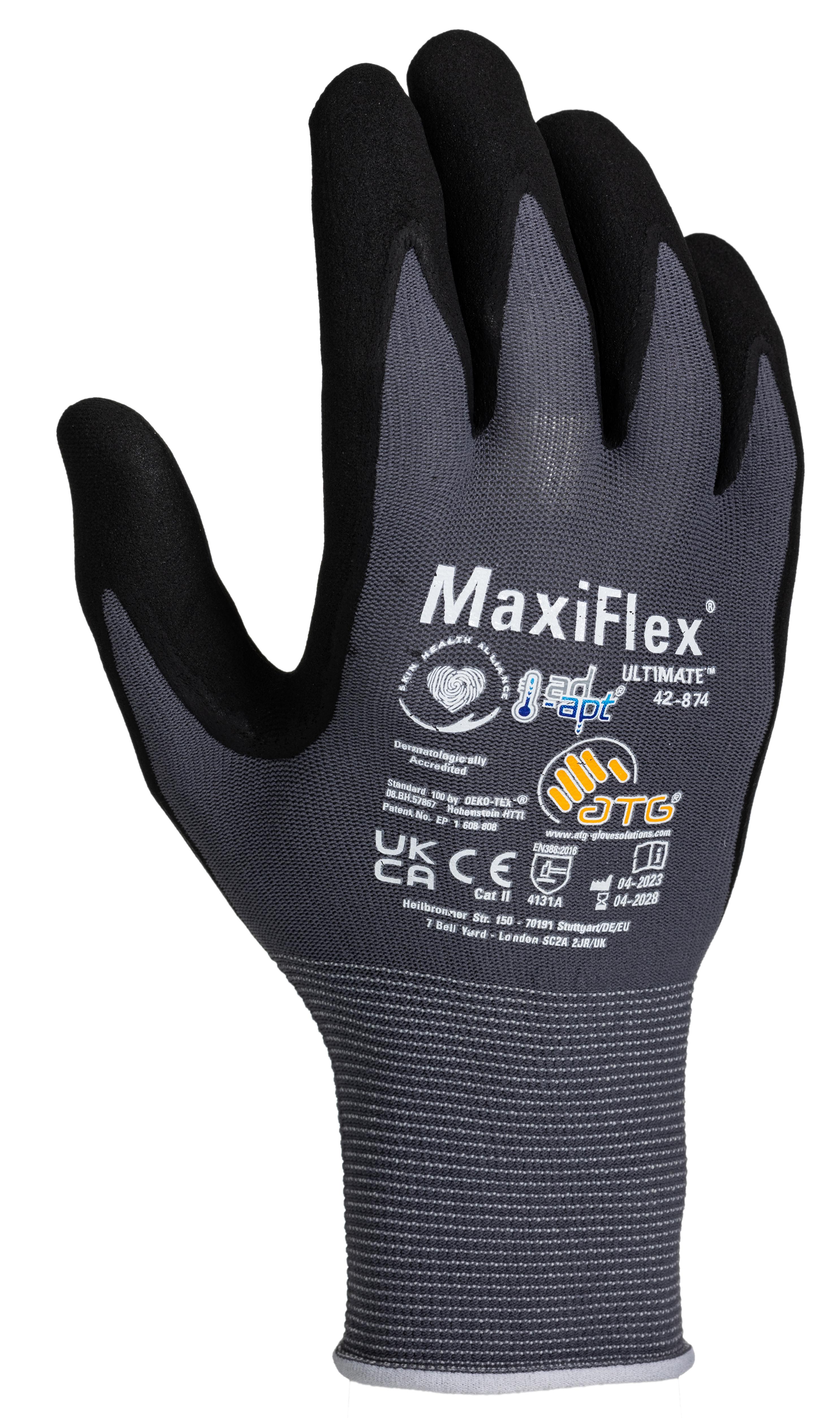 This is Maxiflex Black Grey NBR Coated Spandex Work Gloves Size 8 Medium manufactured by ATG. The manufacturer part number is 42-874-08. It complies with EN407 Thermal standards no . It is compliant with EN374 Chemical standard no . Whereas, its glove coating is of nitrile . It has 3 EN388 tear standard . It complies with EN511 Cold no . The main colour of the glove is grey . The primary recommended applications for the glove is general purpose . It has 1 EN388 Puncture standard . It features maxiflex range. It has 4 EN288 abrasion standard . Additionally, its glove is made using spandex material . The glove has a 8, medium size.