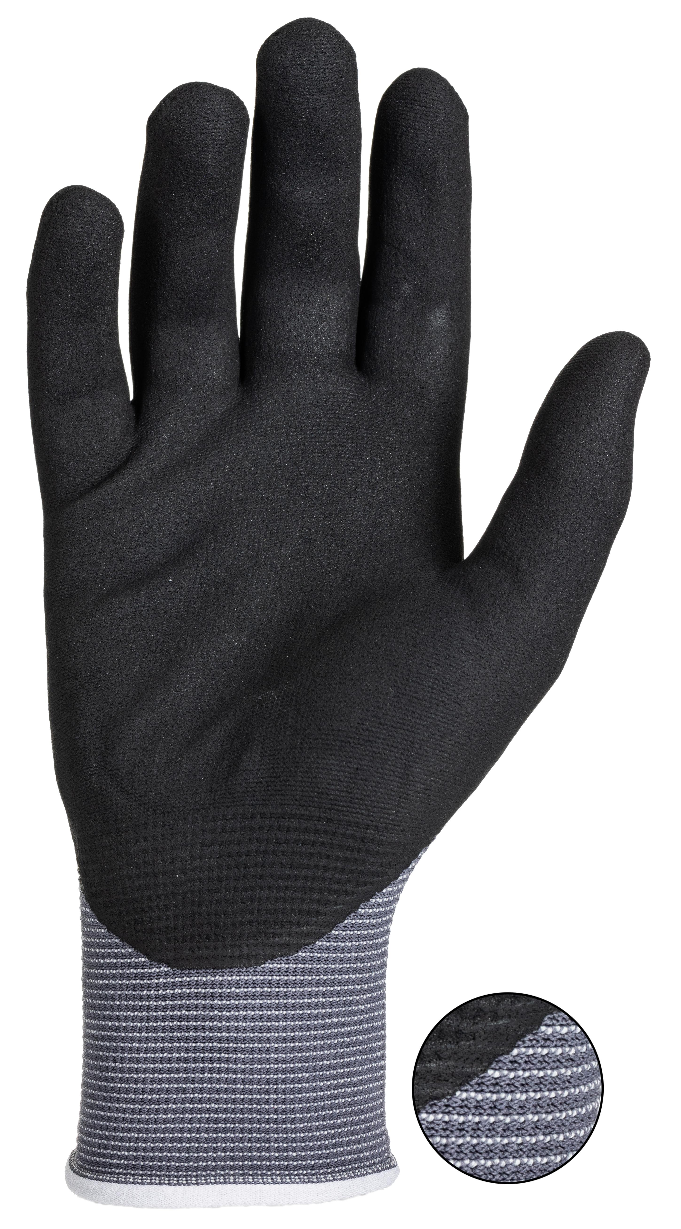 This is Maxiflex Black Grey NBR Coated Spandex Work Gloves Size 9 Large manufactured by ATG. The manufacturer part number is 42-874-09. It complies with EN407 Thermal standards no . It is compliant with EN374 Chemical standard no . Whereas, its glove coating is of nitrile . It has 3 EN388 tear standard . It complies with EN511 Cold no . The main colour of the glove is grey . The primary recommended applications for the glove is general purpose . It has 1 EN388 Puncture standard . It features maxiflex range. It has 4 EN288 abrasion standard . Additionally, its glove is made using spandex material . The glove has a 9, large size.
