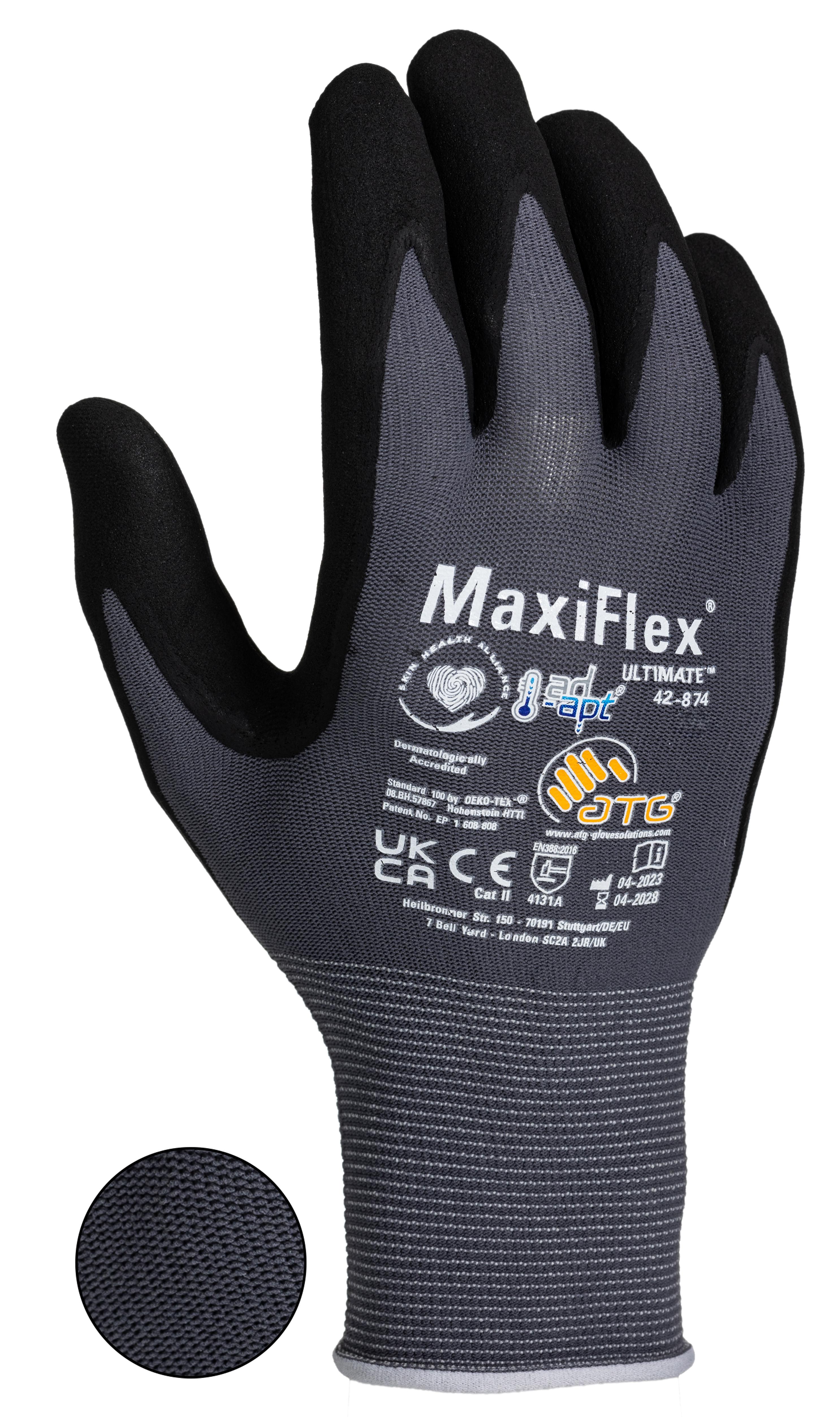 This is Maxiflex Black Grey NBR Coated Spandex Work Gloves Size 10 Large manufactured by ATG. The manufacturer part number is 42-874-10. It complies with EN407 Thermal standards no . It is compliant with EN374 Chemical standard no . Whereas, its glove coating is of nitrile . It has 3 EN388 tear standard . It complies with EN511 Cold no . The main colour of the glove is grey . The primary recommended applications for the glove is general purpose . It has 1 EN388 Puncture standard . It features maxiflex range. It has 4 EN288 abrasion standard . Additionally, its glove is made using spandex material . The glove has a 10, large size.