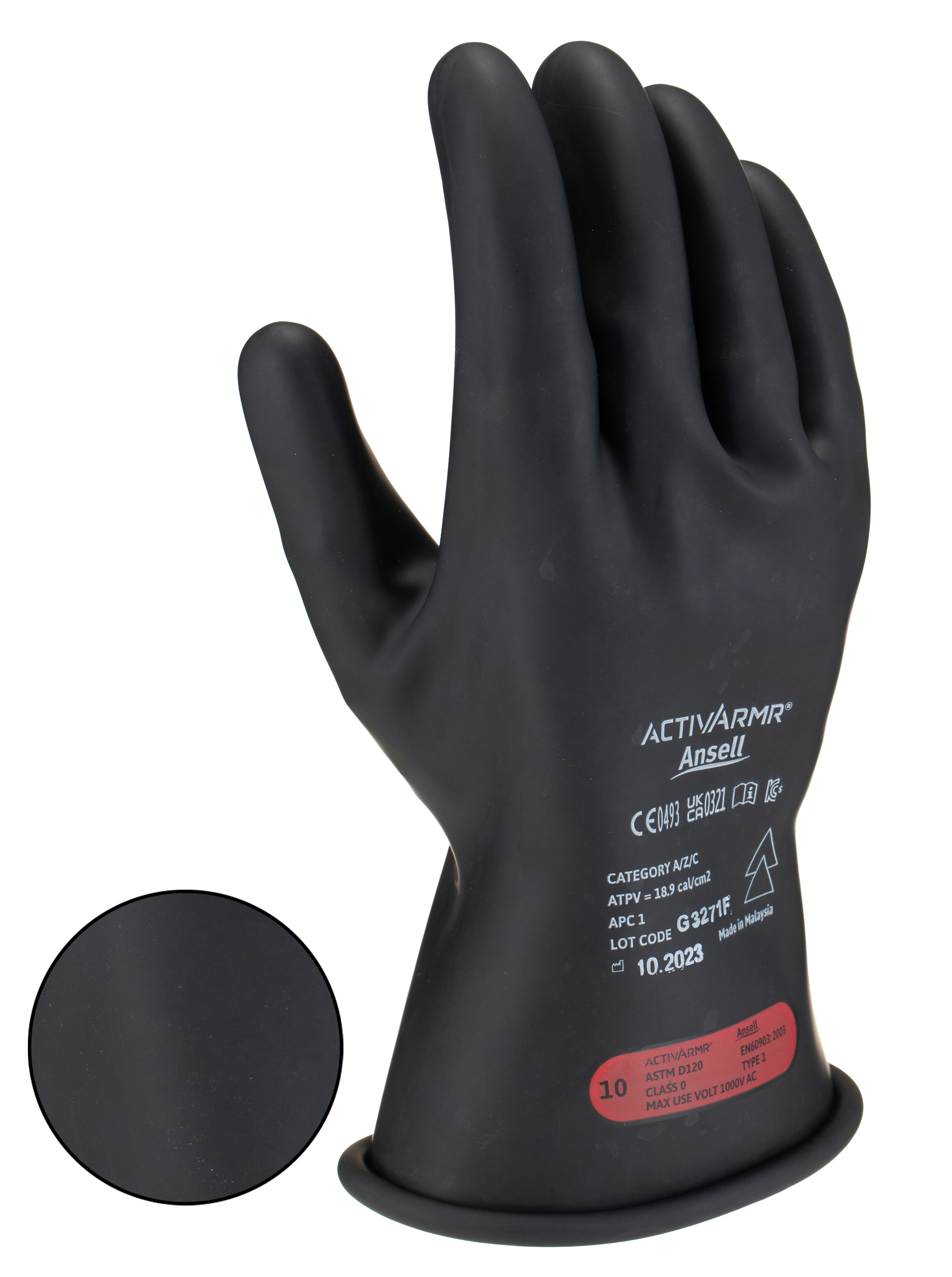 This is Black Natural Rubber Electrical Protection Electrical Insulating Gloves Size 10 Natural Rubber Coating manufactured by Ansell. The manufacturer part number is RIG011B100. It complies with EN407 Thermal standards no . It is compliant with EN374 Chemical standard no . Whereas, its glove coating is of latex . It has 2 EN388 tear standard . It includes 1pair gloves . It complies with EN511 Cold no . The main colour of the glove is black . The primary recommended applications for the glove is electrical protection . It has 1 EN388 Puncture standard . It features rig011b range. It has 3 EN288 abrasion standard . Additionally, its glove is made using latex material . The glove has a 10 size. The product complies with EN 61340-5-1 standard no . It has an additional EN standards of en 60903:2003 class 0 . It has an American safety standard astm .