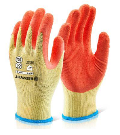 This is Orange Latex Coated Cotton Abrasion Resistant Cut Resistant Puncture Resistant Tear Resistant Work Gloves manufactured by Beeswift. The manufacturer part number is MP1ORL. Additionally, its glove is made using latex coated cotton material . The primary recommended applications for the glove is abrasion resistant, cut resistant, puncture resistant, tear resistant . The glove has a 9, large size. Whereas, its glove coating is of latex . The main colour of the glove is orange .