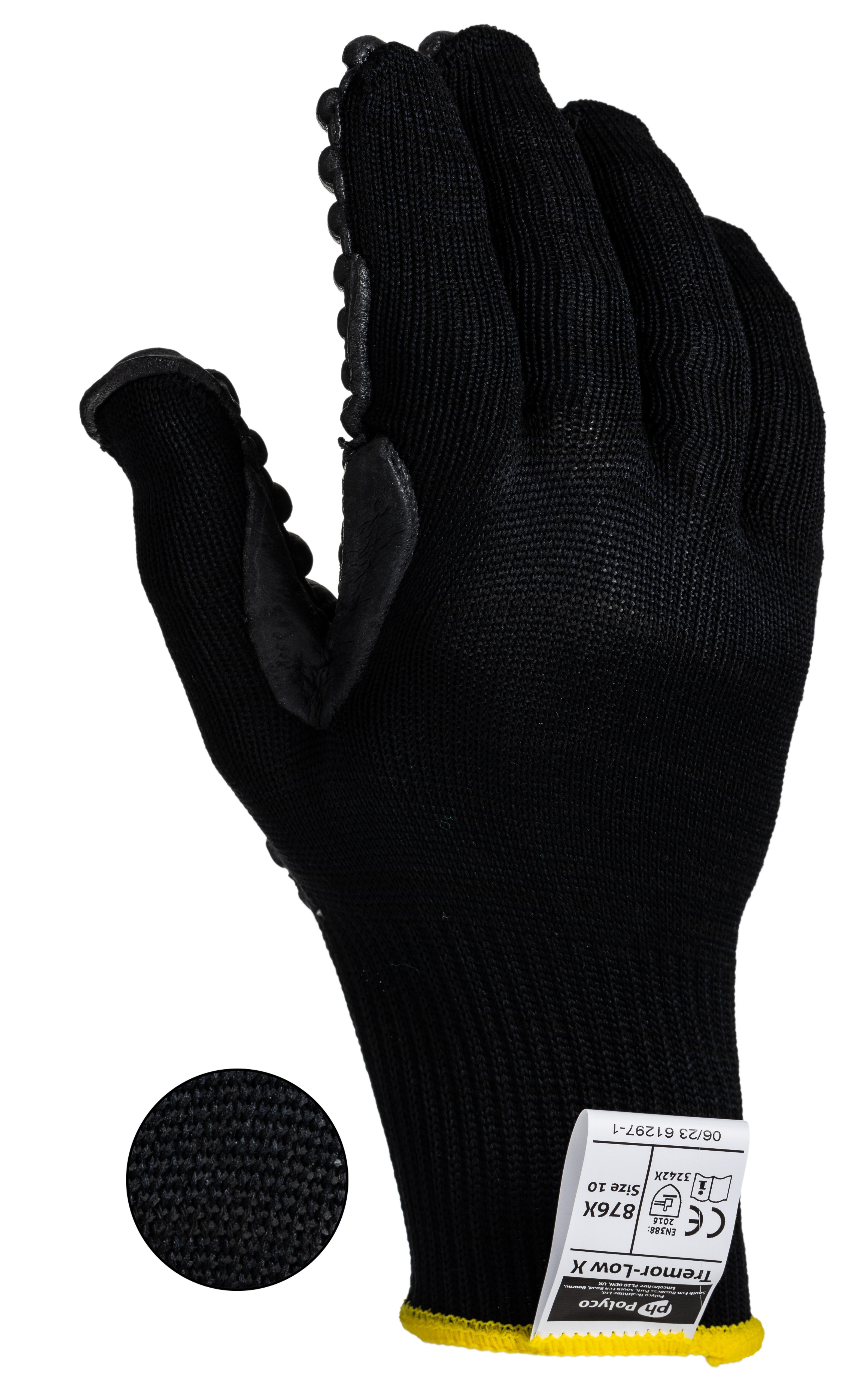 This is Black Anti-Vibration Precision Handling Gloves Size 10 XL manufactured by Polyco Healthline. The manufacturer part number is 876X-10. It complies with EN407 Thermal standards no . It is compliant with EN374 Chemical standard no . It has 4 EN388 tear standard . It complies with EN511 Cold no . The main colour of the glove is black . The product complies with EN 61340-5-1 standard no . It has 2 EN388 Puncture standard . The primary recommended applications for the glove is anti-vibration . It has 3 EN288 abrasion standard . The glove has a 10, xl size.