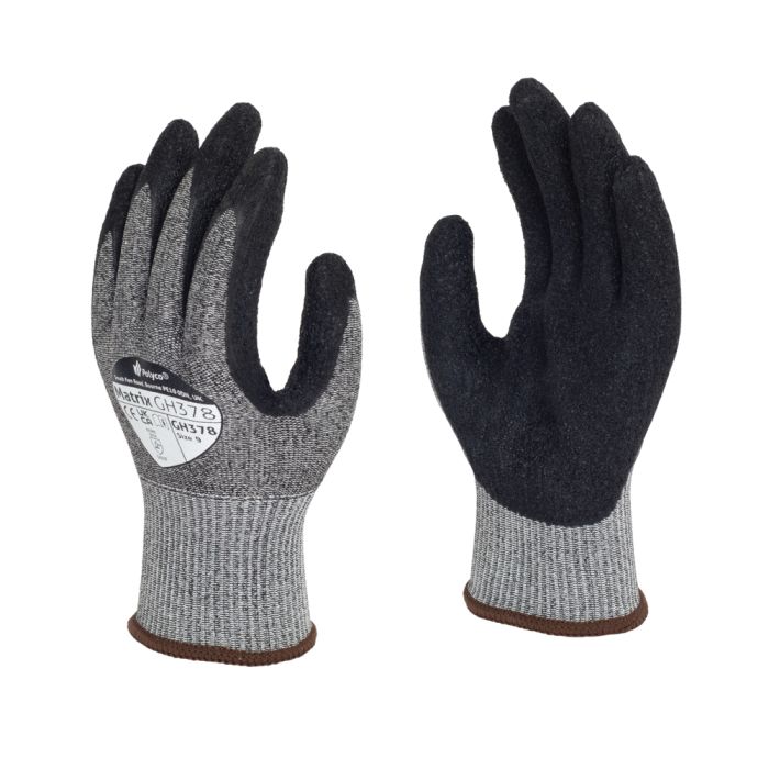 This is Gloves Matrix Crinkle Latex Palm Coated manufactured by Polyco Healthline. The manufacturer part number is GH378-07. It complies with EN407 Thermal standards no . It is compliant with EN374 Chemical standard no . Whereas, its glove coating is of latex . It has 4 EN388 tear standard . It includes 1pair gloves . It complies with EN511 Cold no . The main colour of the glove is grey . The product complies with EN 61340-5-1 standard no . It has 2 EN388 Puncture standard . It has 3 EN288 abrasion standard . Additionally, its glove is made using latex material . The glove has a 7 size.
