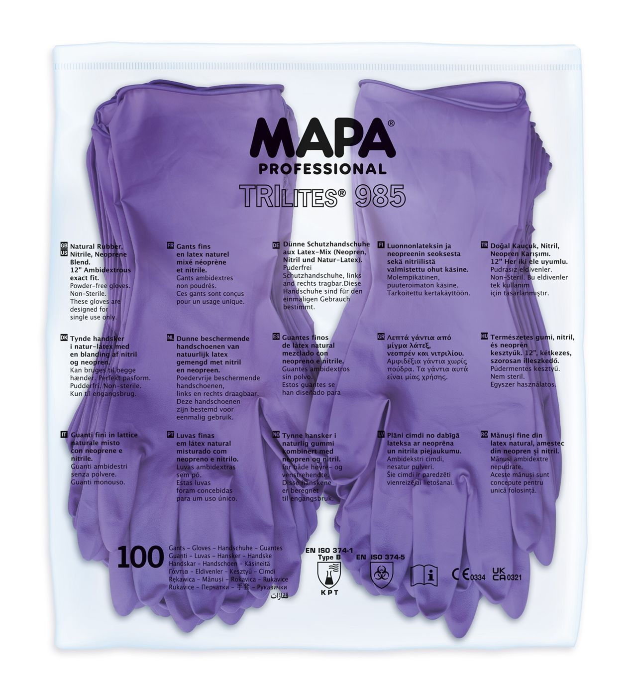 This is TRILITES 985 Purple Latex Neoprene Nitrile Assembly Automotive Industry Construction Emergency Services Work manufactured by Mapa. The manufacturer part number is 3498502 / 9. Additionally, its glove is made using latex, neoprene, nitrile material . It includes 100 gloves . It features trilites 985 range. The glove has a 9 size. It has a decent violet colour.