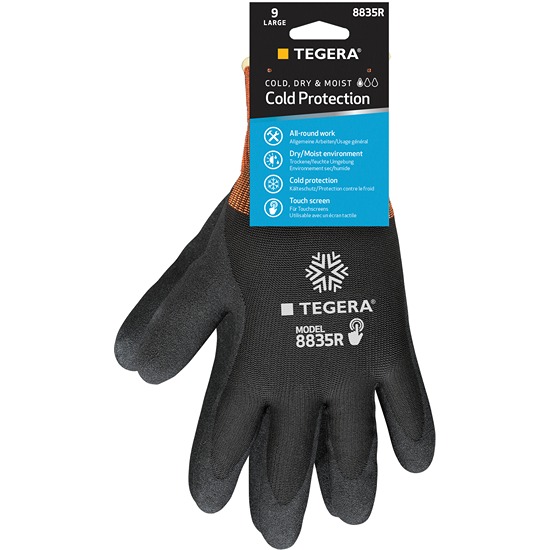 This is TEGERA Black Orange Acrylic Polyester (Liner) Cold Resistant Work Gloves Size 10 Nitrile Foam Coating manufactured by Tegera. The manufacturer part number is 8835R-10. Additionally, its glove is made using acrylic, polyester (liner) material . Whereas, its glove coating is of nitrile foam . It includes 6pairs gloves . The primary recommended applications for the glove is cold resistant . It features tegera range. The main colour of the glove is black, orange . The glove has a 10 size.