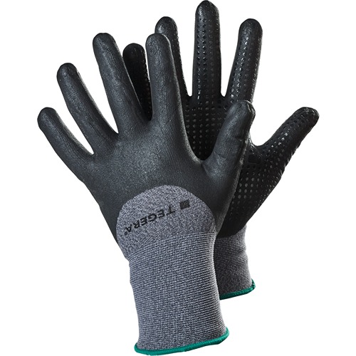 This is TEGERA Black Grey Nylon Spandex Dry Environment Work Gloves Size 10 Nitrile Coating manufactured by Tegera. The manufacturer part number is 874-10. Additionally, its glove is made using nylon, spandex material . Whereas, its glove coating is of nitrile . It includes 12pairs gloves . The primary recommended applications for the glove is dry environment . It features tegera range. The main colour of the glove is black, grey . The glove has a 10 size.