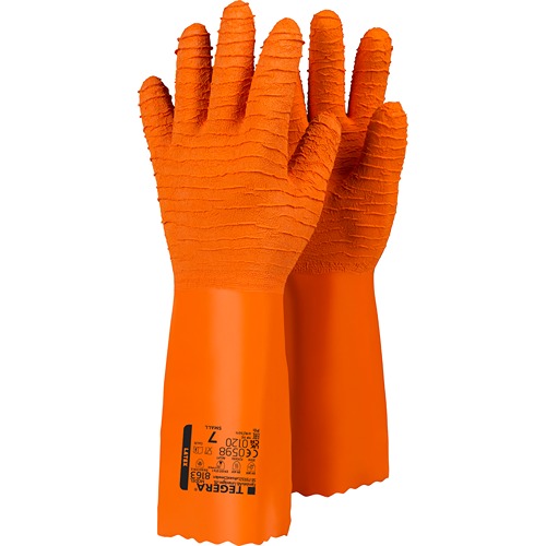 This is TEGERA Orange Cotton Chemical Resistant Work Gloves Size 7 Latex Coating manufactured by Tegera. The manufacturer part number is 8163-7. Additionally, its glove is made using cotton material . Whereas, its glove coating is of latex . It includes 6pairs gloves . The primary recommended applications for the glove is chemical resistant . It features tegera range. The main colour of the glove is orange . The glove has a 7 size.