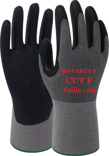 This is BOA SKIN F Black Grey Elastane HPPE Polyethylene Fiber Stainless Steel Abrasion Resistant Cut Resistant manufactured by GUYARD. The manufacturer part number is BOASKIN T9. Additionally, its glove is made using elastane, hppe, polyethylene fiber, stainless steel material . Whereas, its glove coating is of nitrile foam . It includes 10pairs gloves . The primary recommended applications for the glove is abrasion resistant, cut resistant, puncture resistant, tear resistant . It features boa skin f range. The main colour of the glove is black, grey . The glove has a 9 size.