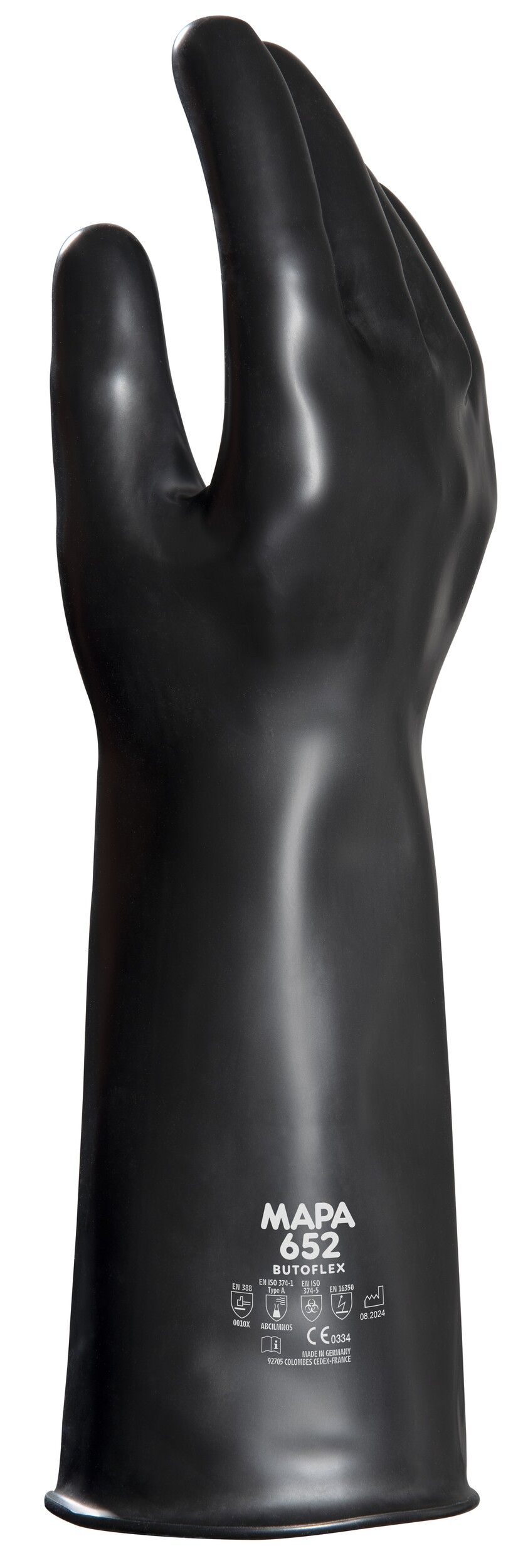 This is Butoflex 652 Black Butyle Abrasion Resistant Chemical Resistant Cut Resistant Puncture Resistant Tear manufactured by Mapa. The manufacturer part number is 3465200 / 8. Additionally, its glove is made using butyle material . It includes 1pair gloves . The primary recommended applications for the glove is abrasion resistant, chemical resistant, cut resistant, puncture resistant, tear resistant . It features butoflex 652 range. The main colour of the glove is black . The glove has a 8 size.
