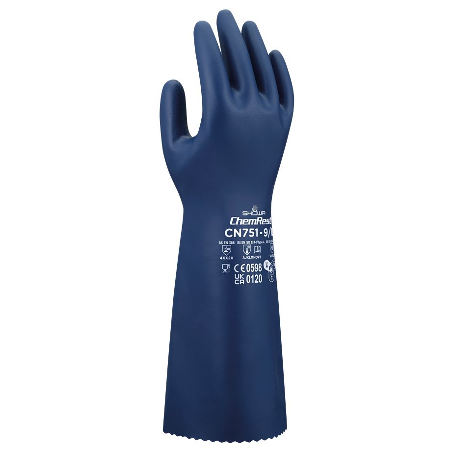 This is CN751 Blue Cotton Chemical Resistant Work Gloves Size XL Nitrile Coating manufactured by Showa. The manufacturer part number is SHOCN7514. Additionally, its glove is made using cotton material . Whereas, its glove coating is of nitrile . It includes 72pairs gloves . The primary recommended applications for the glove is chemical resistant . It features cn751 range. The main colour of the glove is blue . The glove has a xl size.