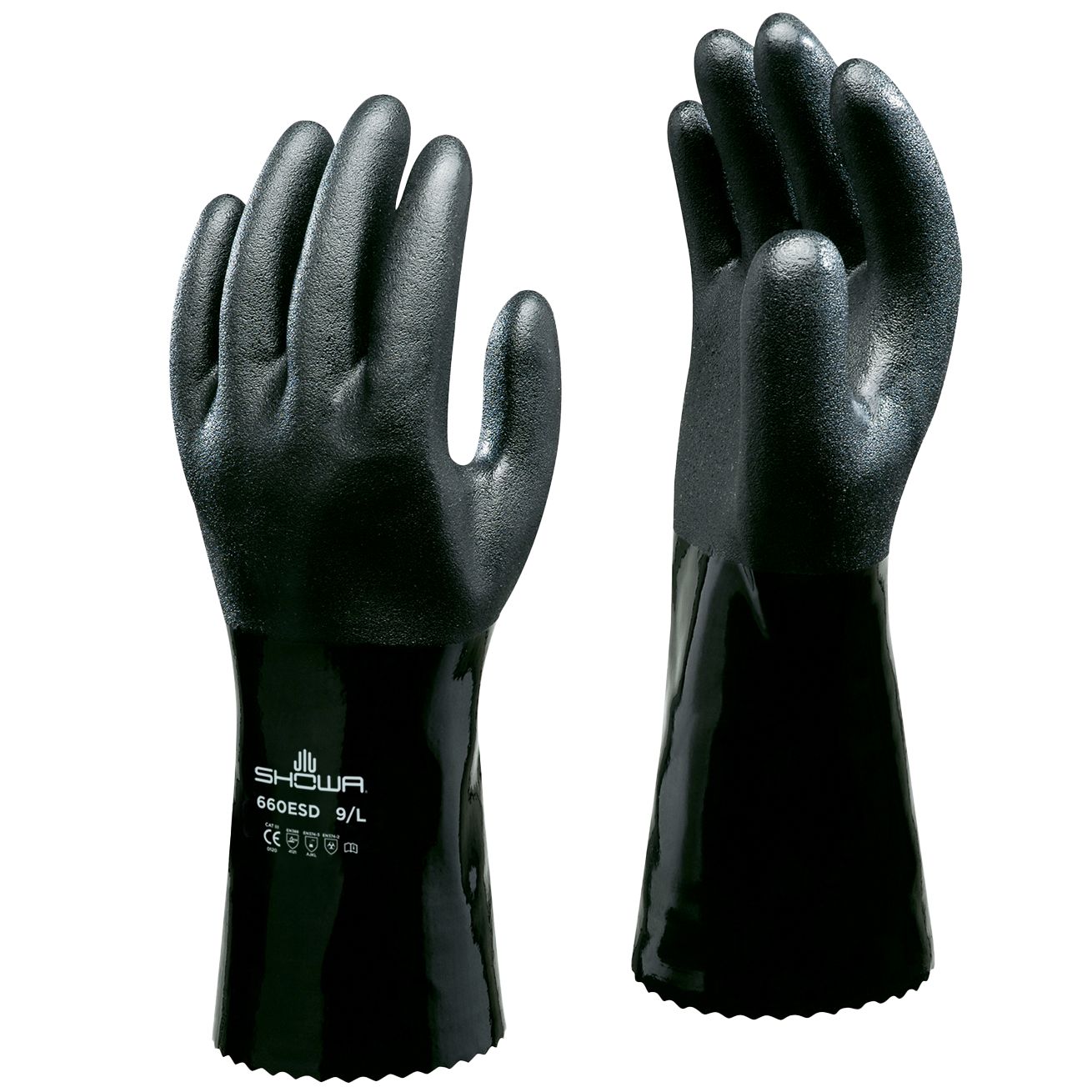 This is 660ESD Black Cotton Anti-Static Chemical Resistant Work Gloves Size XL PVC Coating manufactured by Showa. The manufacturer part number is SHO6704. Additionally, its glove is made using cotton material . Whereas, its glove coating is of pvc . It includes 10pairs gloves . The primary recommended applications for the glove is anti-static, chemical resistant . It features 660esd range. The main colour of the glove is black . The glove has a xl size.
