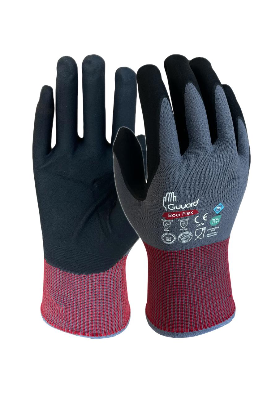 This is BOA FLEX Black Grey Nitrile Nylon Spandex Work Glove Size 9 Nitrile Micro-Foam Coating manufactured by GUYARD. The manufacturer part number is BOAFLEX09. In addition, its lining is made using nylon, spandex material . It includes 10 gloves . The product boa flex, is a highly preferred choice for users. It has a decent black, grey colour. The product is made from highly stable and reliable nitrile, nylon, spandex. It is coated with robust nitrile micro-foam material. work glove is a versatile product designed to provide user-defined applications. The product is available in 9 size.