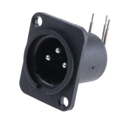 This is 3 Way Right Angle Panel Mount XLR Connector Male Silver over Nickel Plated Contacts manufactured by RS Pro. The manufacturer part number is 455-100. The product has a current rating of 16a. The product is available in panel mount configuration. In addition, male is the available "Gender" of the product. It has a decent black colour. The product also features robust polymer housing material. The high-quality silver over nickel is used as contact plating material. The product contains 3 contacts. It has right angle body orientation. The product is made from sturdy brass materials.