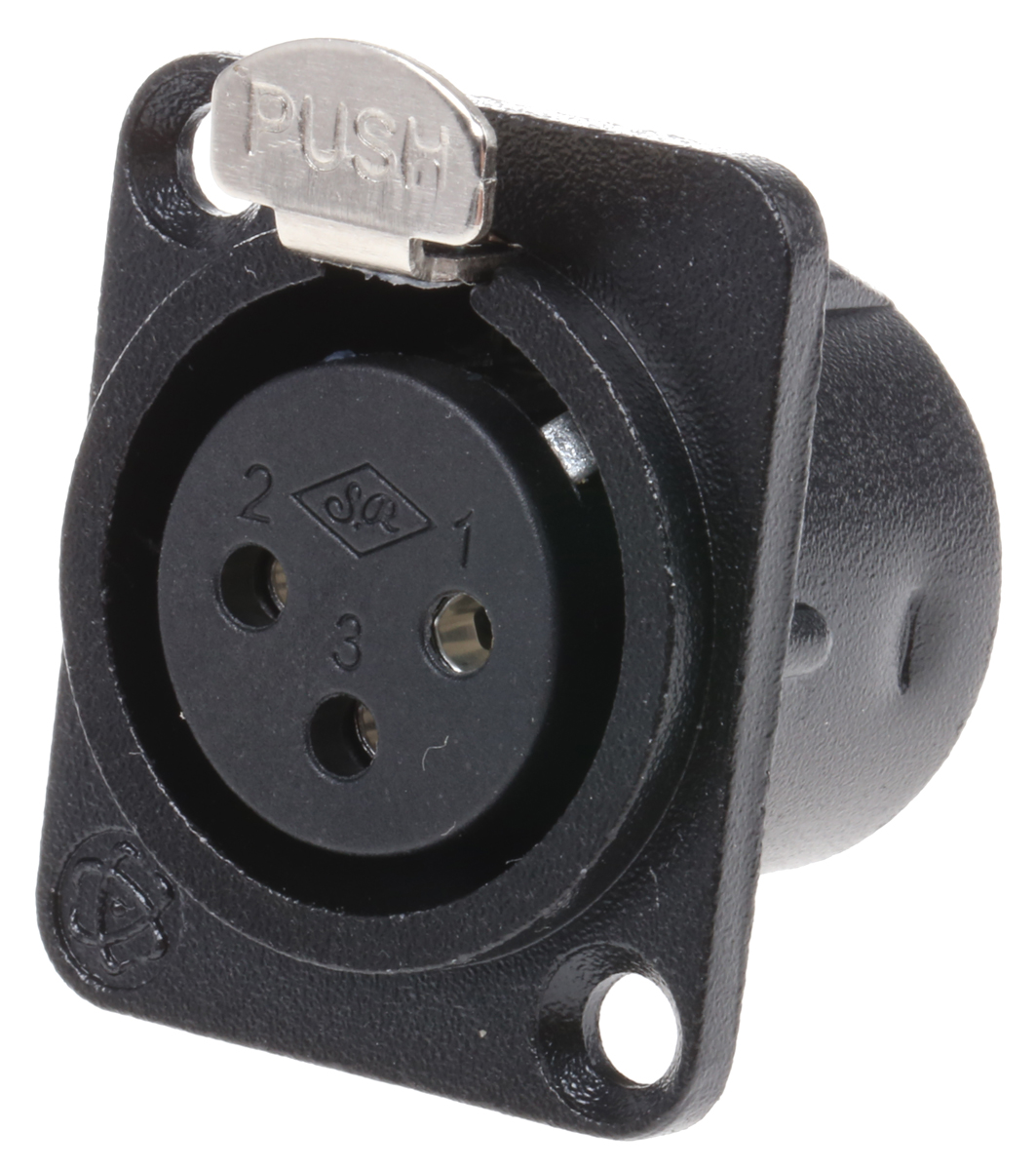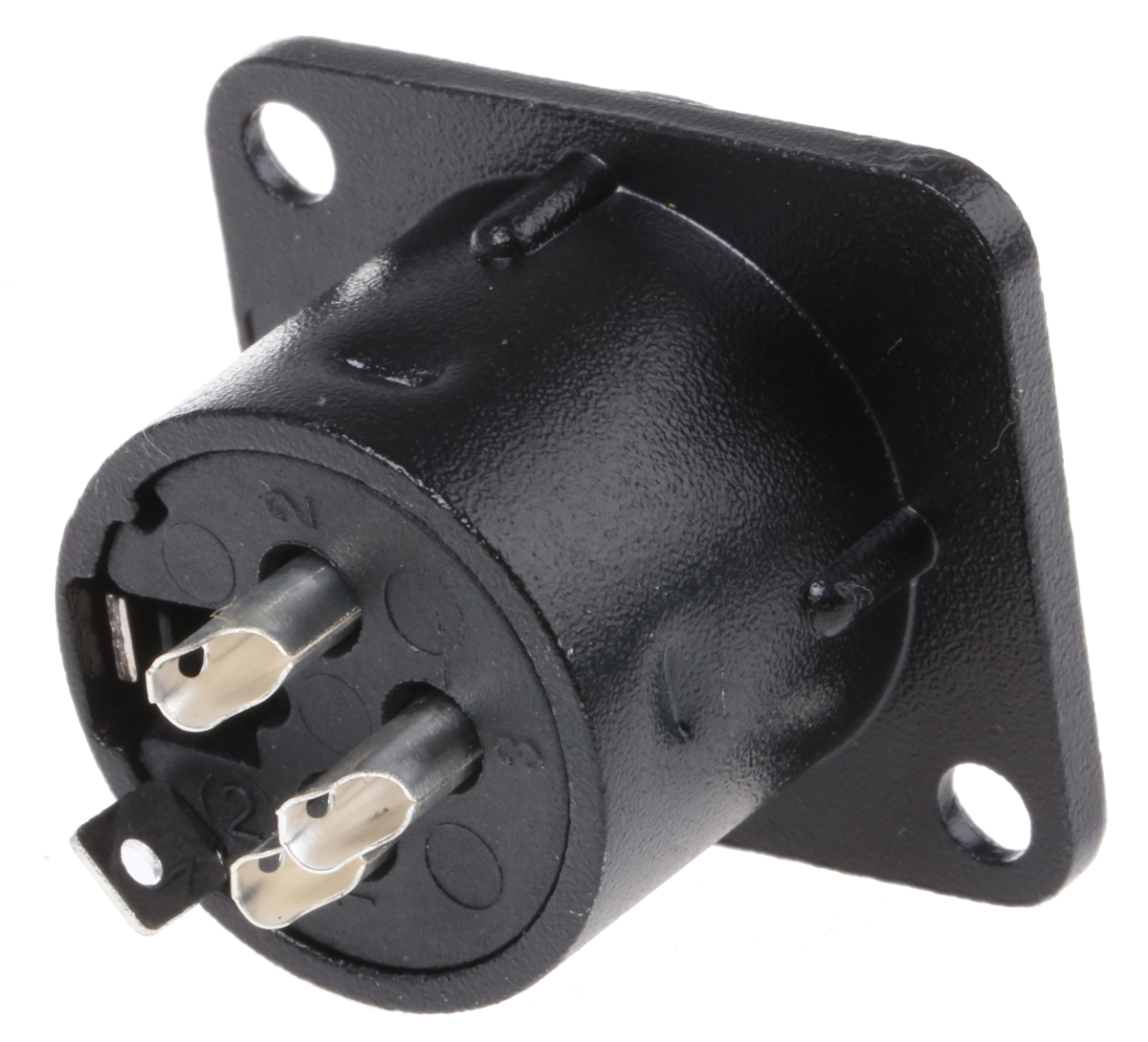 This is 3 Way Panel Mount XLR Connector Female manufactured by RS Pro. The manufacturer part number is 457-942. The product is available in panel mount configuration. In addition, female is the available "Gender" of the product. It has a decent black colour. The product also features robust zinc aluminium alloy housing material. The product contains 3 contacts. It has straight body orientation.