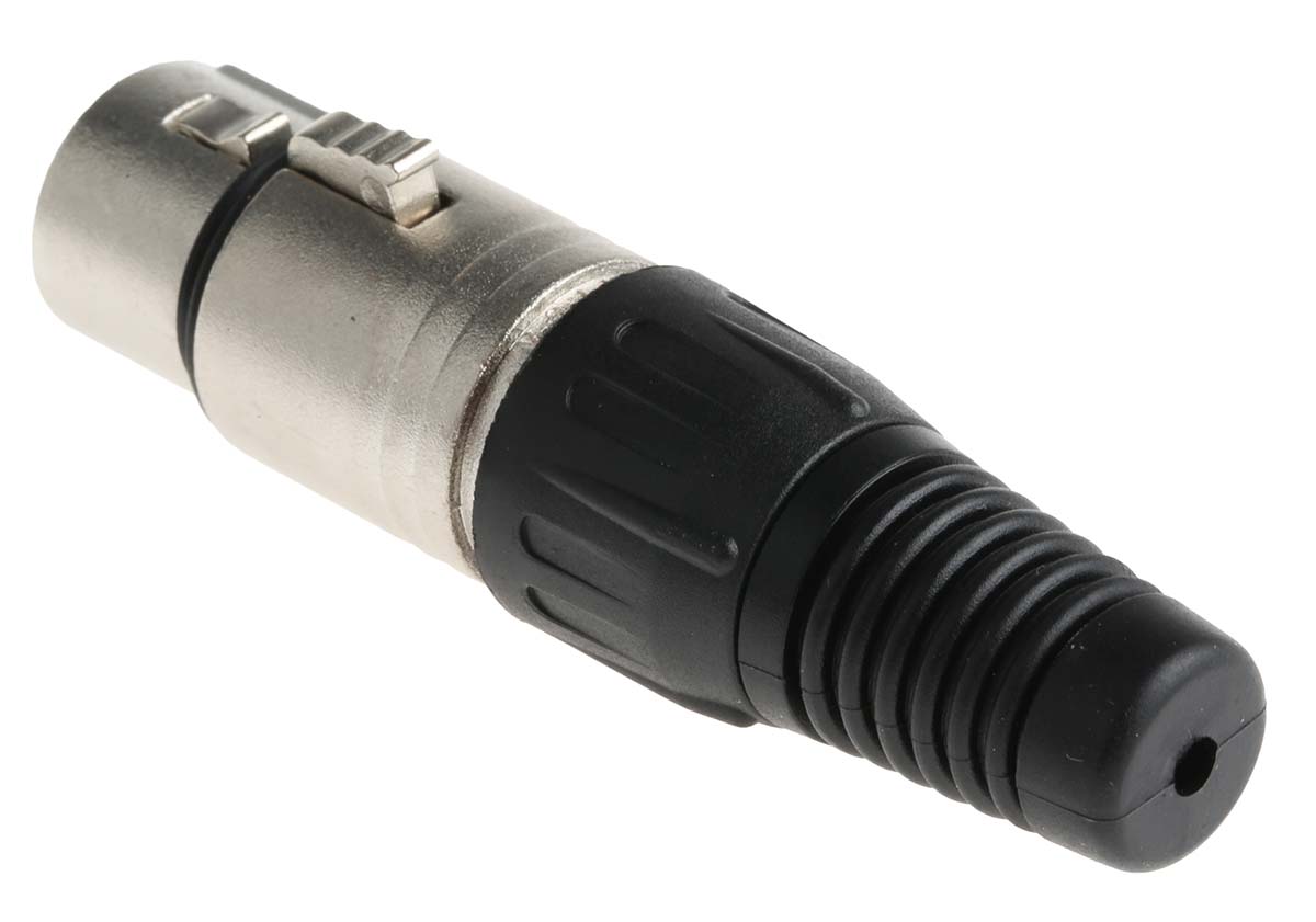 This is 4 Way Cable Mount XLR Connector Female manufactured by RS Pro. The manufacturer part number is 458-008. The product is available in cable mount configuration. In addition, female is the available "Gender" of the product. It has a decent natural colour. The product also features robust zinc aluminium alloy housing material. The product contains 4 contacts. It has straight body orientation.