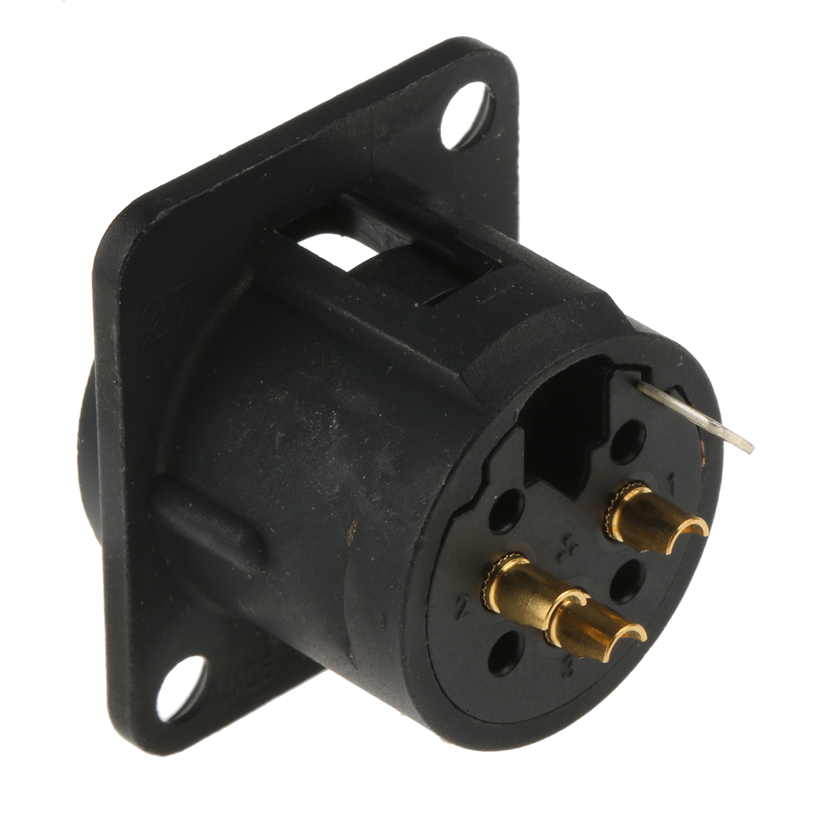 This is 3 Way Panel Mount XLR Connector Male Gold over Nickel Plated Contacts 50 V manufactured by Neutrik. The manufacturer part number is NC3MD-L-B-1. The product has a current rating of 16a. Whereas, the minimum operating temperature of the product is -30°c. The product is available in panel mount configuration. Moreover, the product has a nominal 50 v voltage rating. In addition, male is the available "Gender" of the product. It has a decent black metallic colour. The product also features robust zinc housing material. The high-quality gold over nickel is used as contact plating material. It allows solder termination method. The product contains 3 contacts. It has a maximum operating temperature of +80°c. It has straight body orientation. The product is made from sturdy brass materials.