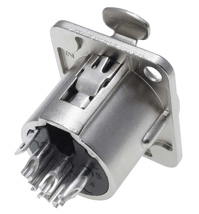 This is Panel Mount XLR Connector Female 50 V 6 Way Nickel Plating manufactured by RS PRO. The manufacturer part number is 208-5183. The product has a current rating of 7.5a. The product is available in panel mount configuration. Moreover, the product has a nominal 50 v voltage rating. In addition, female is the available "Gender" of the product. It has a decent silver colour. xlr Connector type offer robust functionality. The high-quality nickel is used as contact plating material. It allows solder termination method. The product contains 6 contacts. It has straight body orientation.