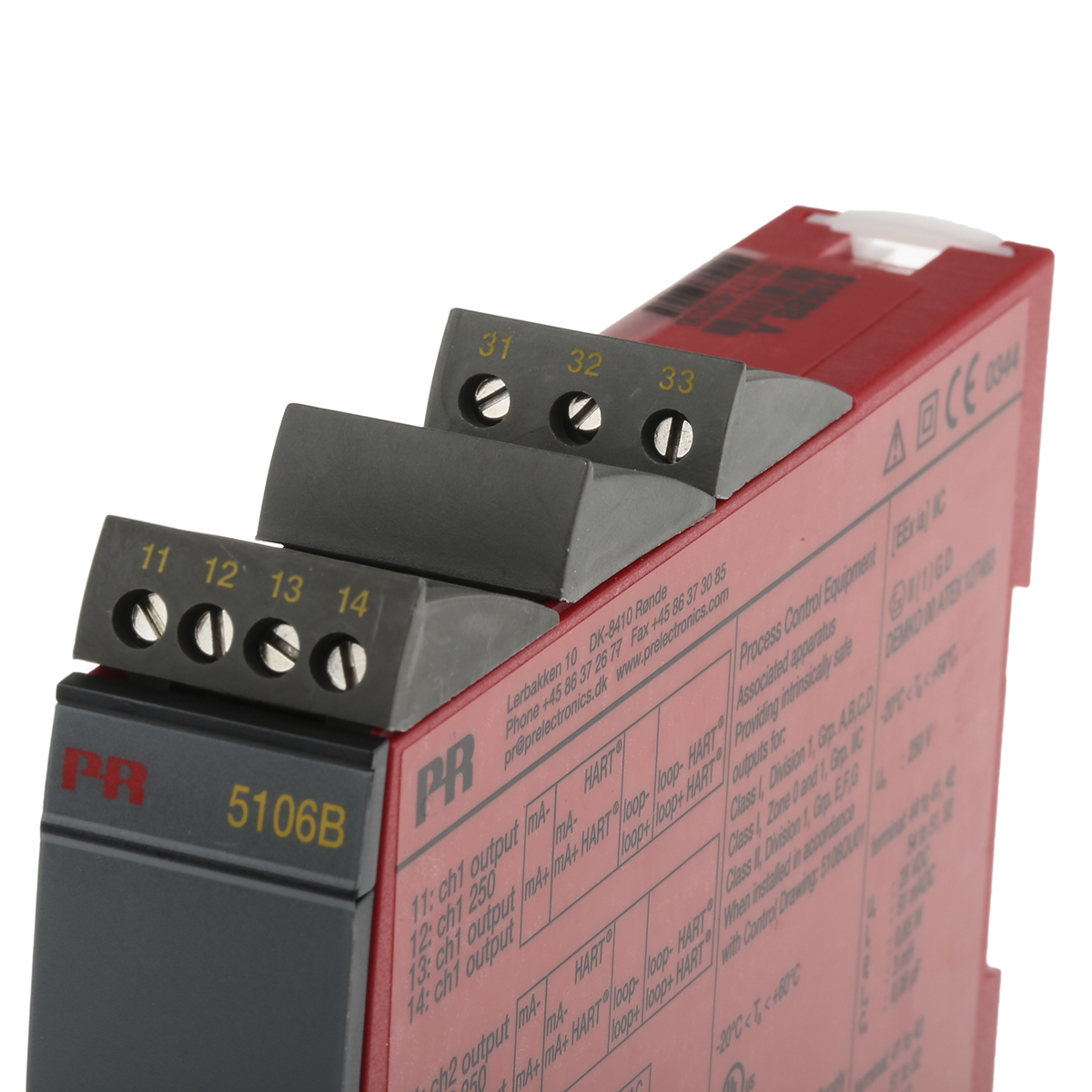This is 1 Channel Isolation Barrier with Transparent Repeater 253 V ac 300 V dc max 400 (Fuse)mA max manufactured by PR Electronics. The manufacturer part number is 5106BBA. Whereas, the minimum operating temperature of the product is -20°c. It is a galvanic barrier barrier. It has a maximum 253 v ac, 300v dc voltage . The product 5100, is a highly preferred choice for users. It has a/an hart transparent repeater type module . It has a maximum 253 v ac, 300 v dc safety voltage . The product is certified with atex, iecex hazardous area certification. It is supplied with 1 channels. Features 19.2 → 300 v dc, 21.6 → 253v ac supply voltage. It has a maximum 400ma safety current . The product has -20 → +60°c of operating temperature range. It has a maximum operating temperature of +60°c. It has a safety 10ω current resistance .