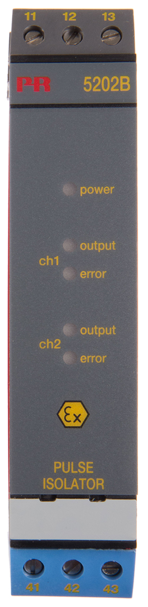 This is 2 Channel Isolation Barrier with NAMUR Input Relay Output 250 V ac max manufactured by PR Electronics. The manufacturer part number is 5202B2. The output signal is a kind of npn, relay. It is a galvanic barrier barrier. It has a maximum 250v ac voltage . The product 5200, is a highly preferred choice for users. It has a/an pulse isolator type module . It has a maximum 250 v ac safety voltage . The product is certified with atex hazardous area certification. The input signal is a kind of namur sensor, switch signal. It is supplied with 2 channels. Features 19.2 → 300 v dc, 21.6 → 253v ac supply voltage. It has a maximum 400ma safety current . The product has -20 → +60°c of operating temperature range. It has a maximum operating temperature of +60°c. Whereas, the minimum operating temperature of the product is -20°c.