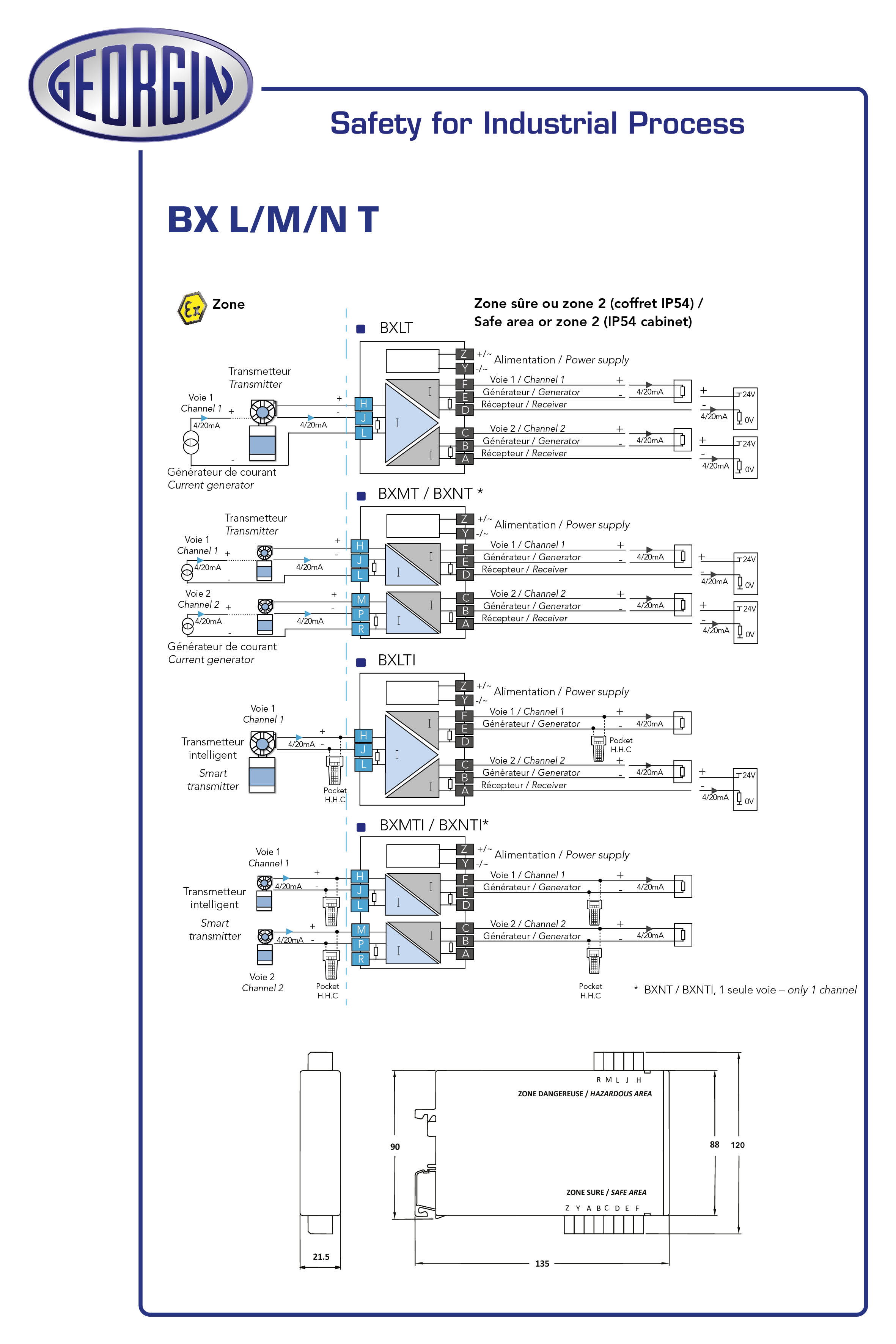 This is Galvanic Barrier manufactured by GEORGIN. The manufacturer part number is BXMT100E. It also carries 80,1ma maximum current. It has a maximum 27,5v voltage . The product bxmt, is a highly preferred choice for users. It is a galvanic barrier barrier. The product is certified with atex hazardous area certification. It is supplied with 2 channels. Features 230v ac supply voltage. Whereas, the minimum operating temperature of the product is -20°c. The product has -20°c to 60°c of operating temperature range. It has a maximum operating temperature of +60°c.
