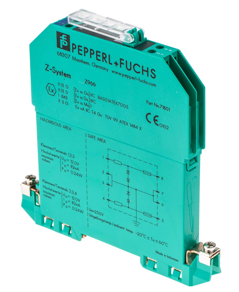 This is Zener Barrier With Analog Input 82mA max manufactured by Pepperl + Fuchs. The manufacturer part number is 261549. It also carries 82ma maximum current. It has a maximum 250v voltage . It has a maximum 82ma safety current . It has a/an zener barrier type module . It has a maximum 250 v safety voltage . It is a zener barrier barrier. The product is certified with atex hazardous area certification. It is supplied with 2 channels. Features 11.1v ac supply voltage. Whereas, the minimum operating temperature of the product is -20°c. The product has -20 → +60°c of operating temperature range. It has a maximum operating temperature of +60°c. It has a safety 166ω current resistance .