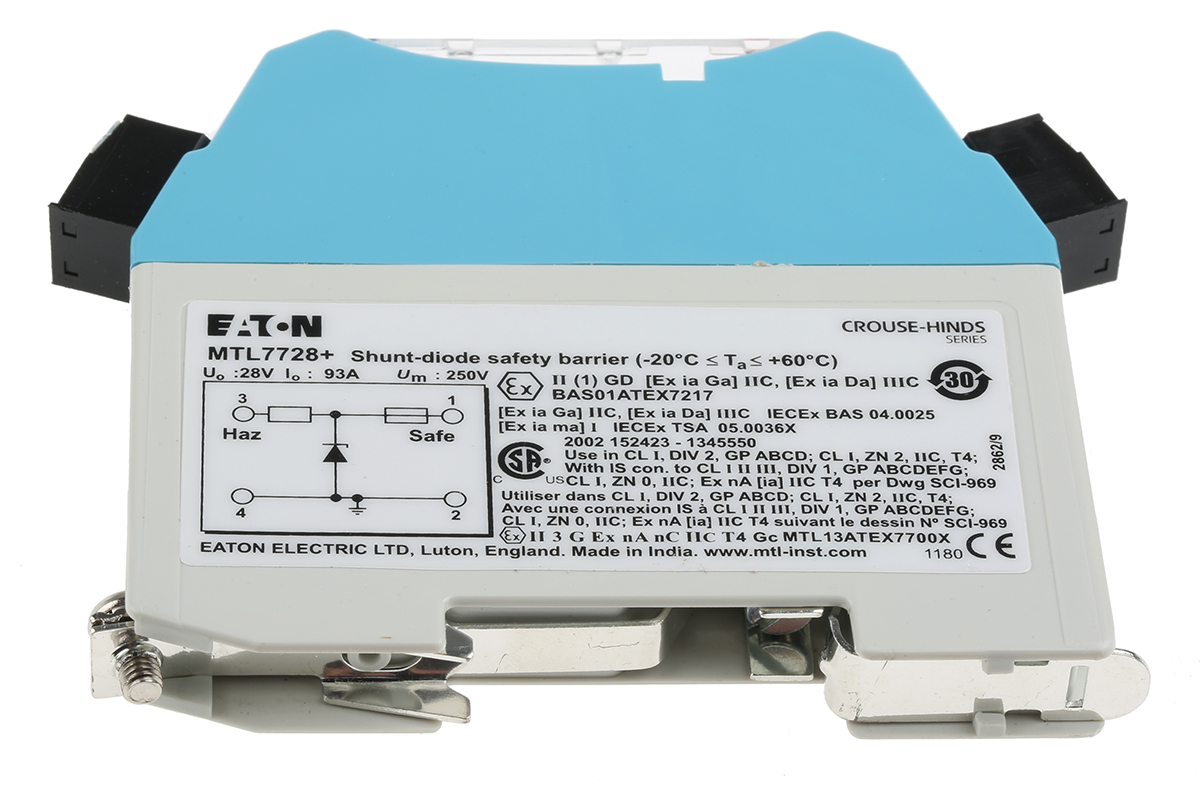 This is 1 Channel Zener Barrier Intrinsic Safety Barrier Digital Output ATEX manufactured by Eaton. The manufacturer part number is MTL7728+/RS. The output signal is a kind of digital. It also carries 93ma maximum current. It has a maximum 26v dc voltage . The product mtl7700, is a highly preferred choice for users. It has a/an intrinsic safety barrier type module . It has a maximum 26 v dc safety voltage . It is a zener barrier barrier. The product is certified with atex hazardous area certification. It is supplied with 1 channels. Features 28v dc supply voltage. Whereas, the minimum operating temperature of the product is -20°c. It has a maximum 93ma safety current . The product has maximum of +65°c of operating temperature range. It has a maximum operating temperature of +65°c. It has a safety 300ω current resistance .