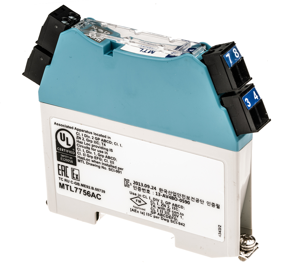 This is 3 Channel Zener Barrier Intrinsic Safety Barrier RTD Thermocouple Input ATEX manufactured by Eaton. The manufacturer part number is MTL7756AC/RS. It also carries 300ma maximum current. It has a maximum 2.7v dc voltage . The product mtl7700, is a highly preferred choice for users. It has a/an intrinsic safety barrier type module . It has a maximum 2.7 v dc safety voltage . It is a zener barrier barrier. The product is certified with atex hazardous area certification. The input signal is a kind of rtd, thermocouple signal. It is supplied with 3 channels. Features 3v dc supply voltage. Whereas, the minimum operating temperature of the product is -20°c. It has a maximum 300ma safety current . The product has maximum of +65°c of operating temperature range. It has a maximum operating temperature of +65°c. It has a safety 10ω current resistance .