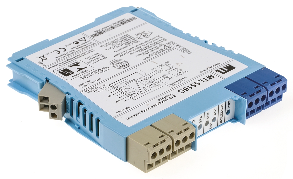 This is 2 Channel Zener Barrier Switch/Proximity Detector Interface NAMUR Sensor Switch Input Relay Output ATEX manufactured by Eaton. The manufacturer part number is MTL5516C/RS. The output signal is a kind of relay. It also carries 14ma maximum current. It has a maximum 10.5v voltage . The product mtl5500, is a highly preferred choice for users. It has a/an switch/proximity detector interface type module . It has a maximum 10.5 v safety voltage . It is a galvanic barrier barrier. The product is certified with atex hazardous area certification. The input signal is a kind of namur sensor, switch signal. It is supplied with 2 channels. Features 20 → 35v dc supply voltage. Whereas, the minimum operating temperature of the product is -20°c. It has a maximum 14ma safety current . The product has -20 → +60°c of operating temperature range. It has a maximum operating temperature of +60°c.