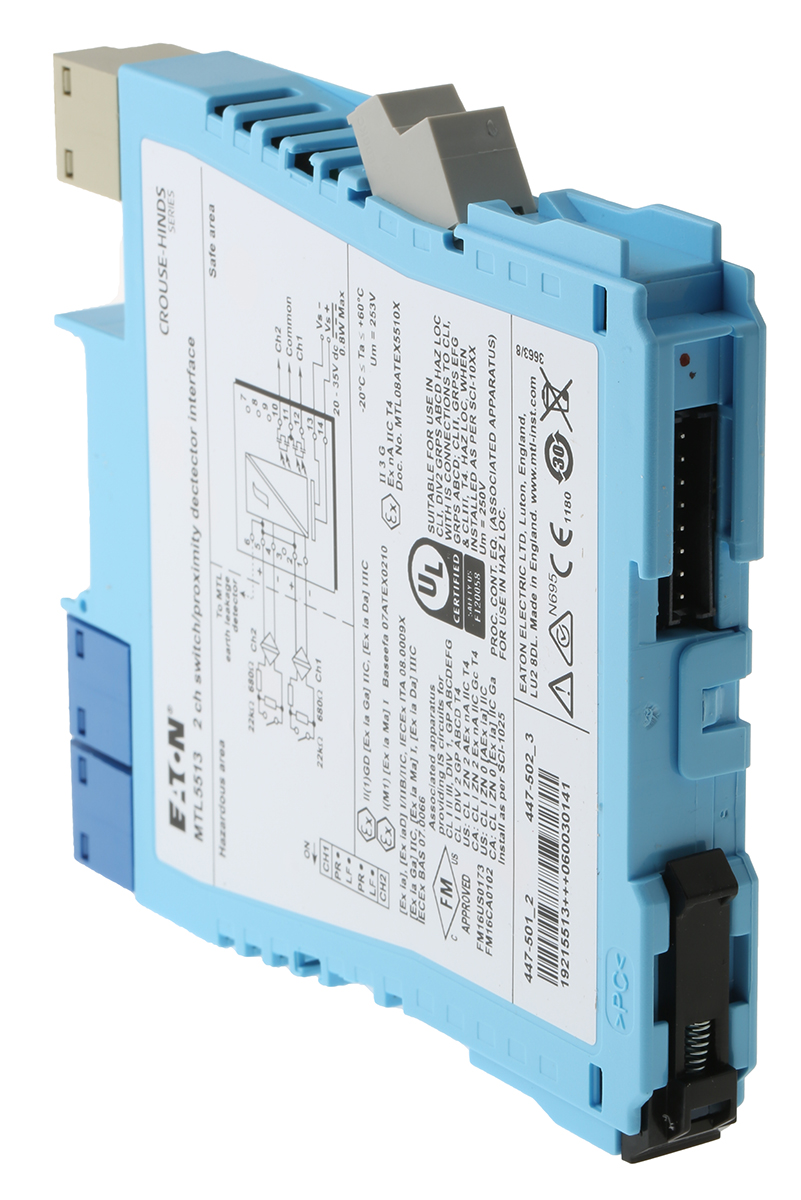 This is 2 Channel Zener Barrier Solenoid Driver NAMUR Sensor Switch Input ATEX manufactured by Eaton. The manufacturer part number is MTL5513/RS. It also carries 14ma maximum current. It has a maximum 10.5v voltage . It has a maximum 14ma safety current . It has a/an solenoid driver type module . It has a maximum 10.5 v safety voltage . It is a galvanic barrier barrier. The product is certified with atex hazardous area certification. The input signal is a kind of namur sensor, switch signal. It is supplied with 2 channels. Features 20 → 35v dc supply voltage. Whereas, the minimum operating temperature of the product is -20°c. It has a maximum operating temperature of +60°c.
